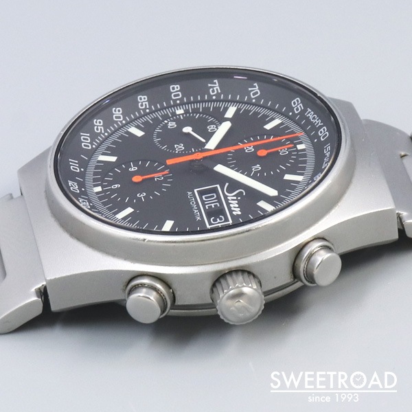 ドイツ軍パイロットで飛行教官でもあったヘルムート・ジンが、自らの名前をブランドに冠し誕生した、プロユースの時計メーカー「Sinn/ジン」。 本商品は、超精密仕上げ・機能性・作業性・操作性そして視認性をテーマに開発されたコンパクトなクロノグラフモデルです。 1kmの走行時間で時速を換算できるタキメーター表示に、15パルス(脈拍)のカウント時間で1分間の脈拍を測ることができるパルスメーターを備えています。 曜日カレンダーはドイツ語表記が採用されています。 外装には若干の小傷がございますが、目立つようなダメージは見られない良好な状態です。 ベルトは、ジン純正のステンレスブレスが装着されており、全長約18.5cm、フリップロックを伸ばすと全長約22.5cmまで伸びます。