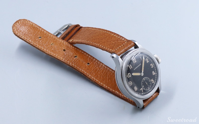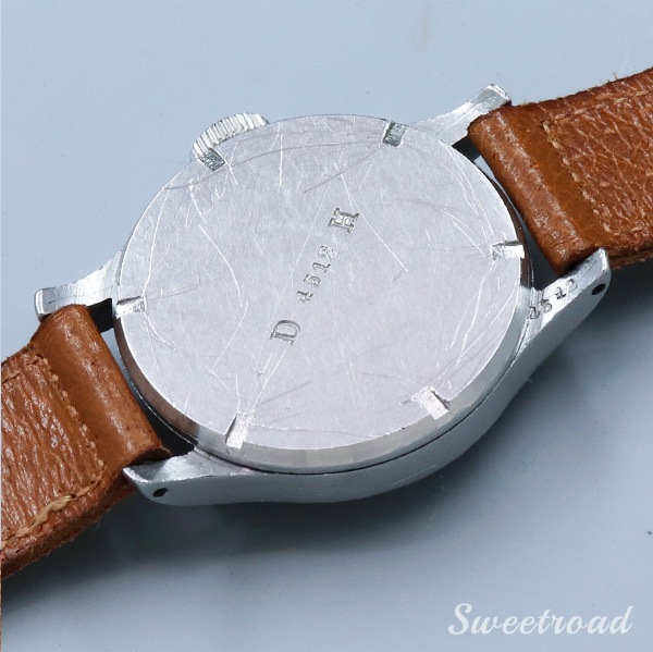 第二次世界大戦時に使用されていた、ロンジンのドイツ軍用モデルが入荷しました。 スクリューバック仕様の厚みのあるケースに、裏蓋には《D.H》と刻印されています。 「DH」は「Deutsche Heer」の略で「Deutsche」は制式時計、「Heer」は陸軍を意味しています。 顔立ちもミリタリーらしく、ツヤ感のしっかり残ったオリジナルブラックミラーに視認性の高いアラビア数字インデックス、スモールセコンド、レイルミニッツなど魅力的なディティールが詰まっています。 外装には使用感がございますが、ケースエッジはしっかりとしており、全体的に雰囲気抜群です。 ムーブメントは耐震装置付きの名機cal.12.68Z。サビや劣化は見られず、コンディション良好な個体です。 ベルトは、ヴィンテージモデルに相性抜群な「Accurate Form(アキュレイトフォルム)」のレザーベルトを装着しています。