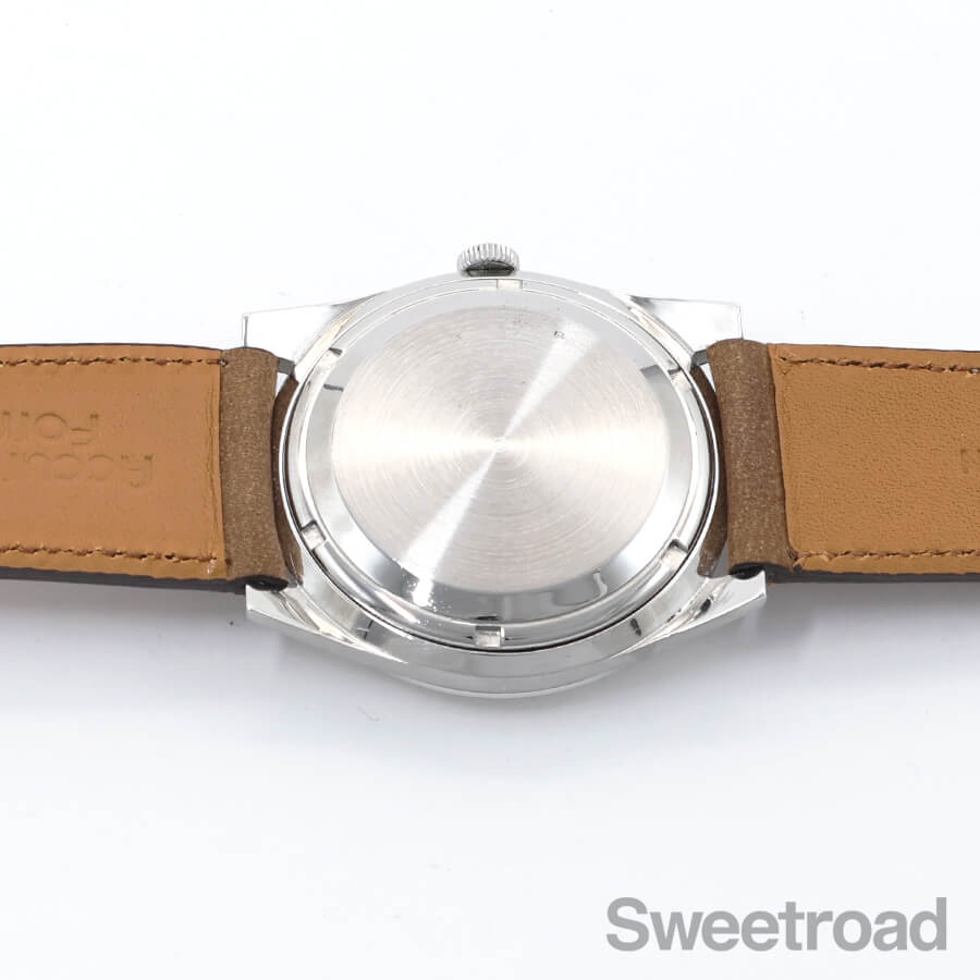 希少性の高い36ミリ径のラージケースが採用された、IWCのヴィンテージモデルが入荷しました。 美しいサンレイ仕上げのシルバーダイヤルに、アプライド仕様のIWCロゴやミニッツドットが配された、シンプルながら上品なフェイスデザインが目を惹く個体です。 ほんのりと焼けたヴィンテージらしい文字盤が魅力的で、全体的に特筆すべき傷みは見られず良好な状態を保っています。 裏蓋にわずかな傷みは見受けられる程度で、ケースエッジやヘアラインはしっかりと残っており、純正の魚リューズも付いています。 ラグ足が短くデザインされているため、革ベルトとケースに隙間が生まれないというのも魅力的なポイントです。 ムーブメントはペラトン式自動巻Cal.8541Bを搭載。 ベルトはアキュレイトフォルムのレザーベルトを装着しています。 当店にてOH(分解掃除)を行っております。
