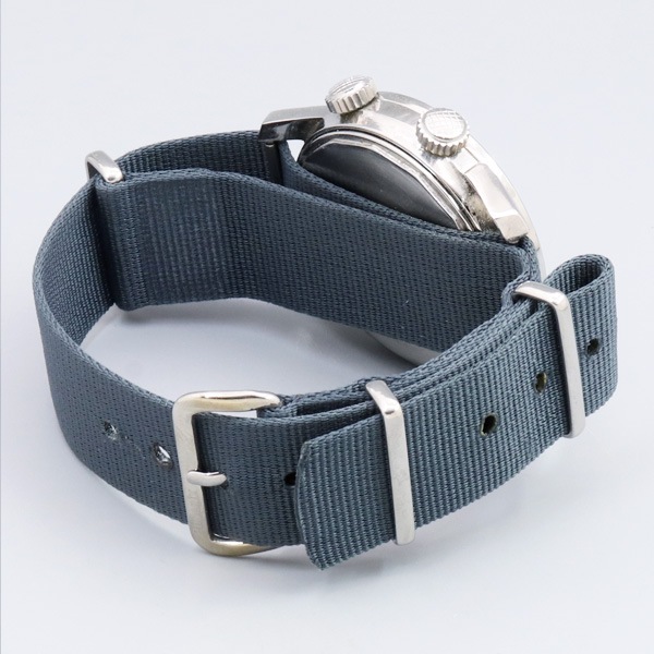 ダブルリューズ仕様で、2時側のリューズでインナーベゼルの操作、4時側のリューズで針操作を行います。 ベルトの接続部分はバネ棒式ですので、交換しやすくなっています。