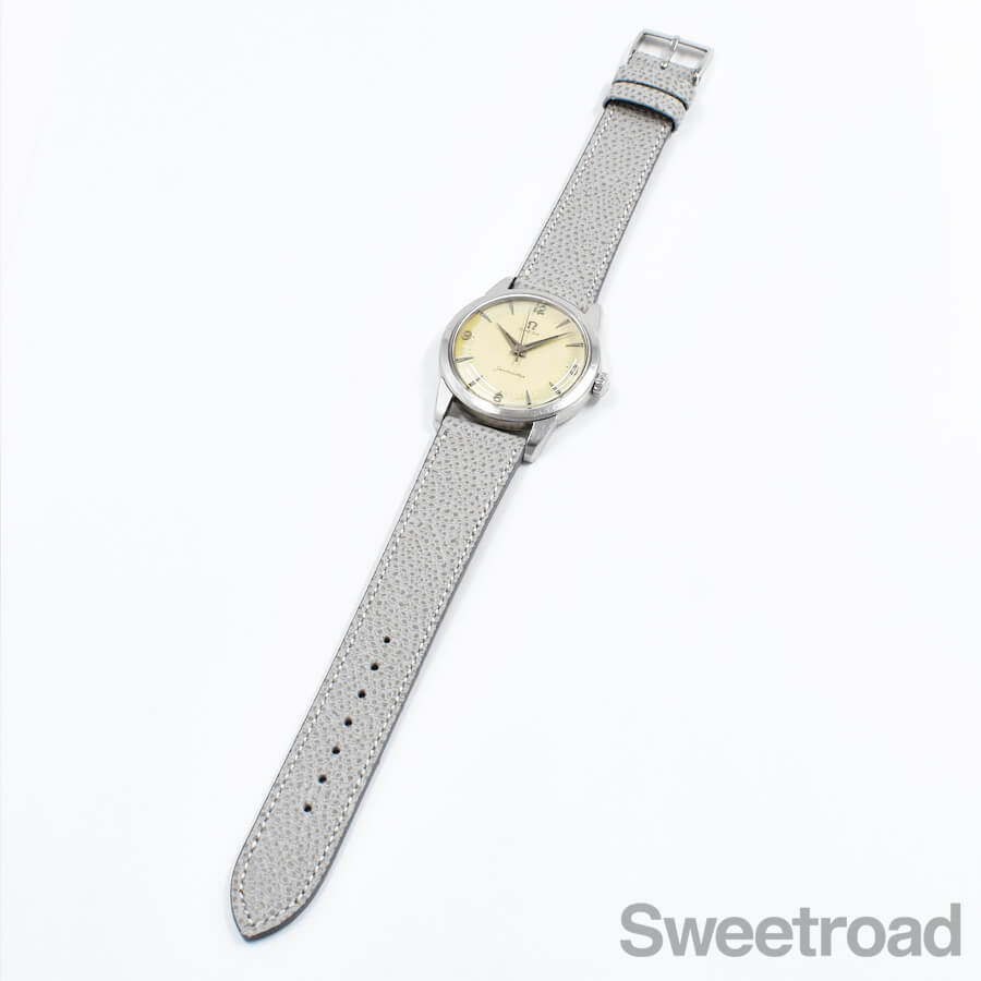 12・3・6・9アラビアやドーフィン針が配された、オールドな顔立ちが目を惹きます。