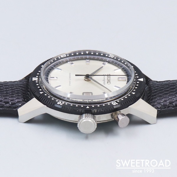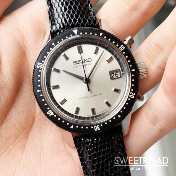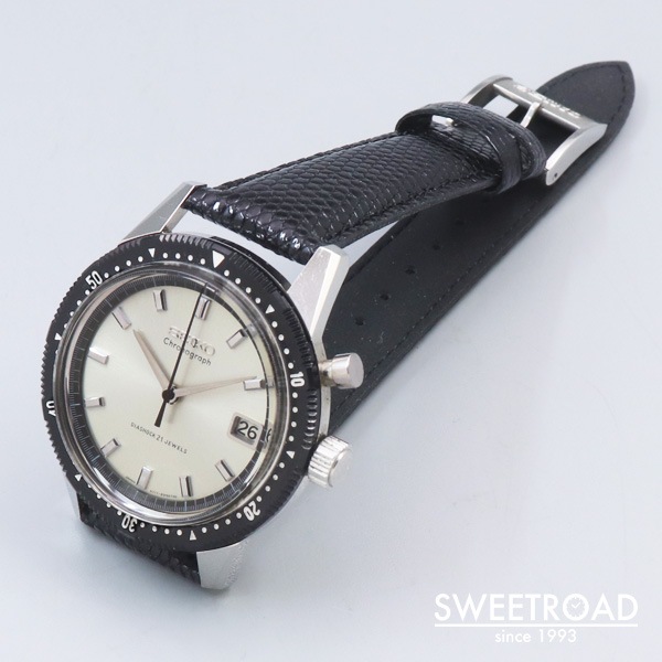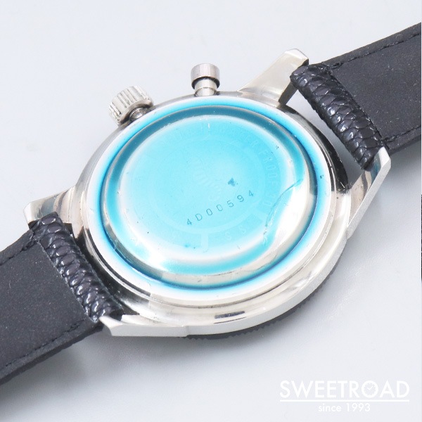 - 1964年製造のセイコーのヴィンテージモデル「ワンプッシュクロノグラフ」が入荷しました。 東京オリンピックを記念して販売された国産初のクロノグラフ時計です。 通常のクロノグラフと違い、一つのプッシュボタンでスタート・ストップ・リセットを行う特殊な仕組みになっております。 本商品は、裏蓋保護シールが綺麗に残った貴重な未使用の個体です。 文字盤は傷みの少ない綺麗なシルバーダイヤル。 外周には細かいメモリが配されたメタリックグレーのリングが配されており、高級感を醸し出しています。 ベゼルは初期型のプラスチックベゼルが装着されており、こちらも傷や劣化の見受けられない良好なコンディションです。 ケースには保管時の小傷はありますが、雰囲気を損ねるような傷みはなく、裏蓋の刻印もしっかりと読み取れます。 ベルトは後年のセイコー純正レザーベルトに純正の尾錠が取り付けられております。