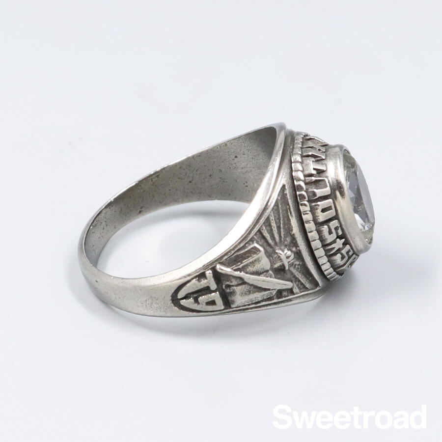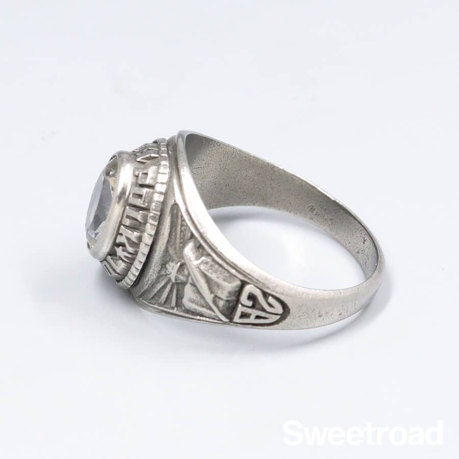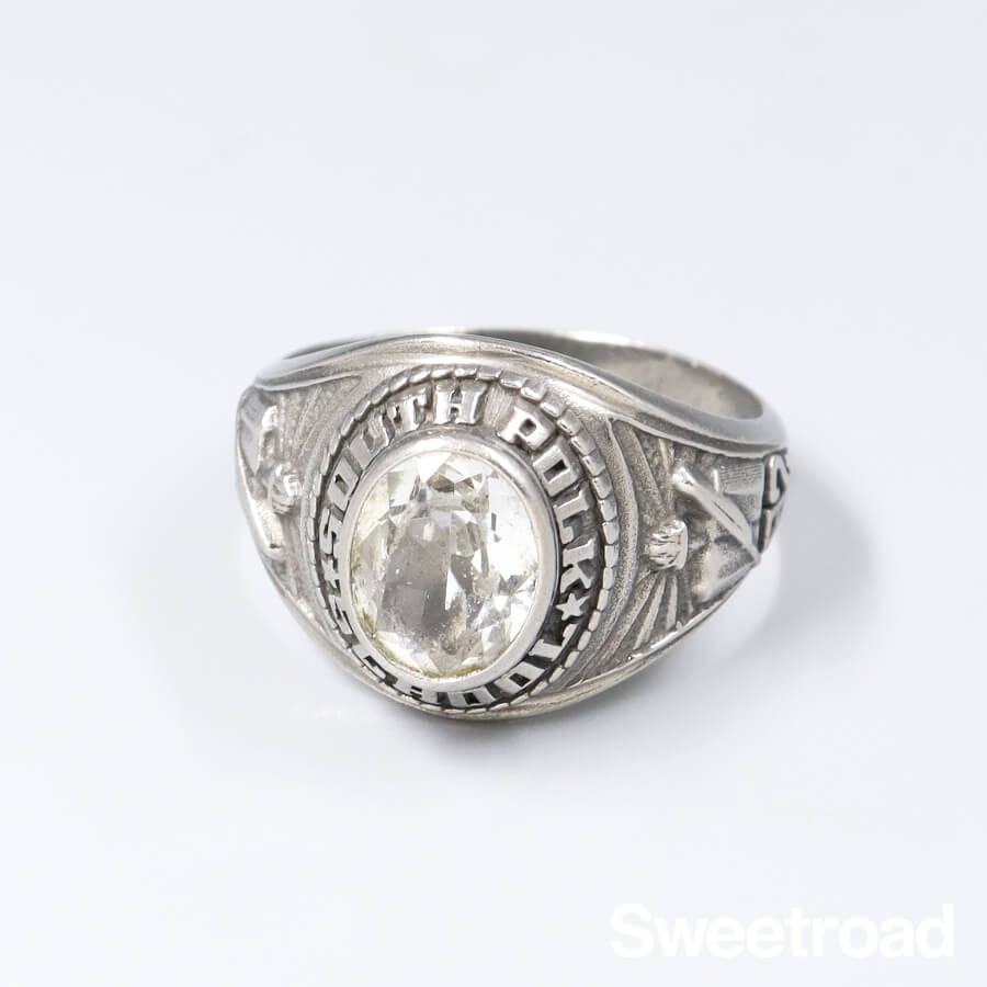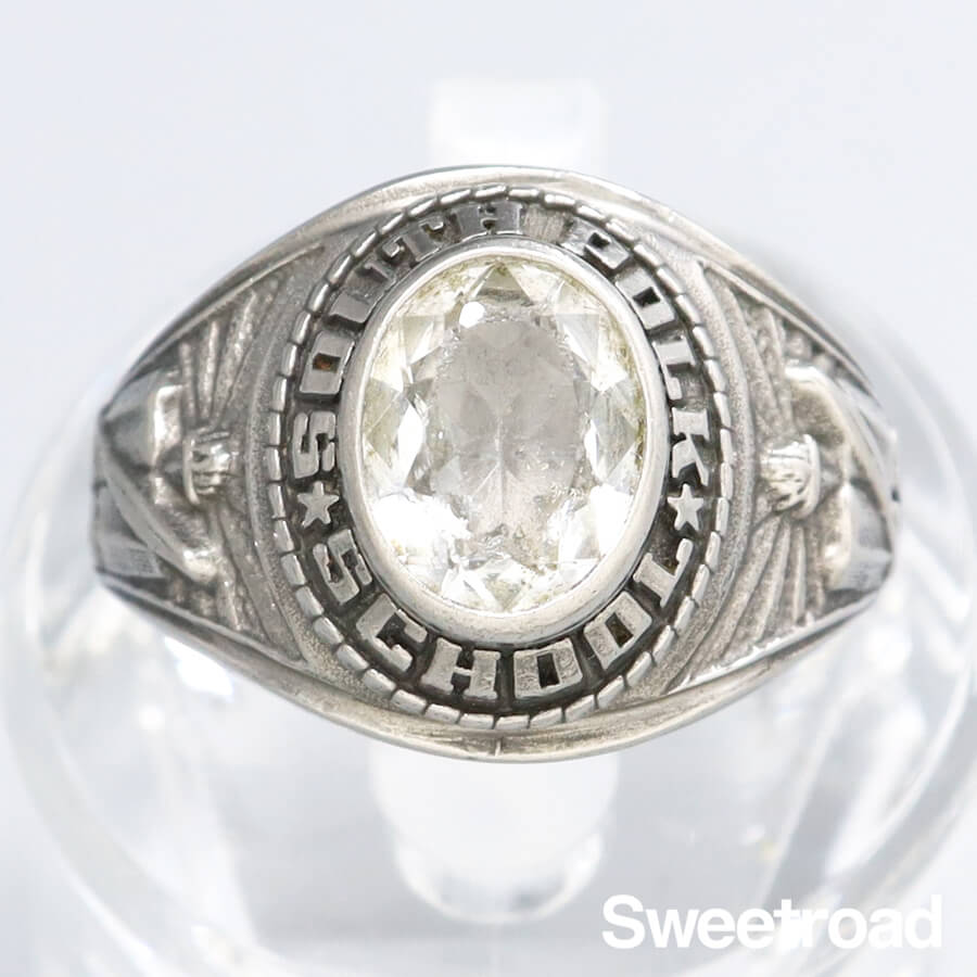 - アメリカ・テネシー州にある「South Polk Elementary School(サウス ポーク エレメンタリー スクール)」 のカレッジリングです。 少し高さのあるベゼルデザインが魅力的な個体で、意外と少ないクリアストーンが採用されているのもポイントです。 石に若干の欠けが見られますが、それほど目立つようなものではなく、ヴィンテージらしい良い雰囲気を醸し出しています。 1982年生まれの方のバースイヤーアイテムとしてもオススメです。