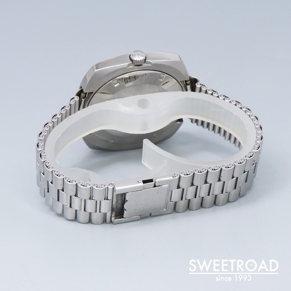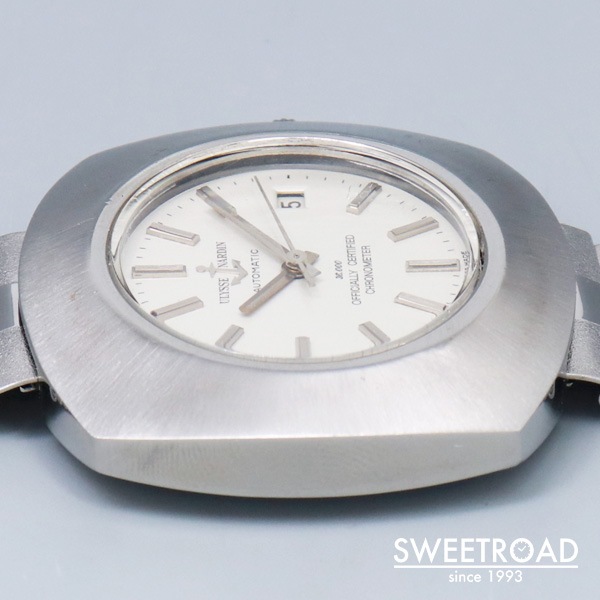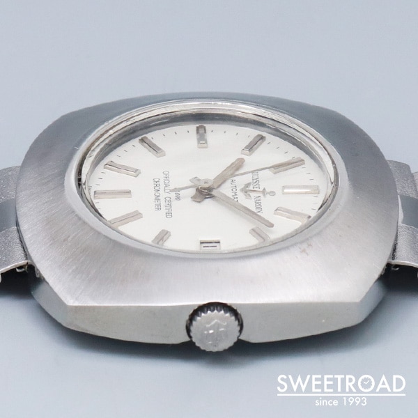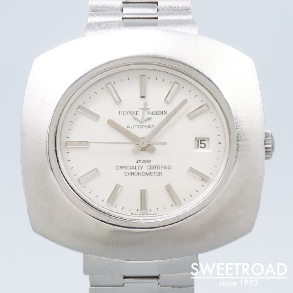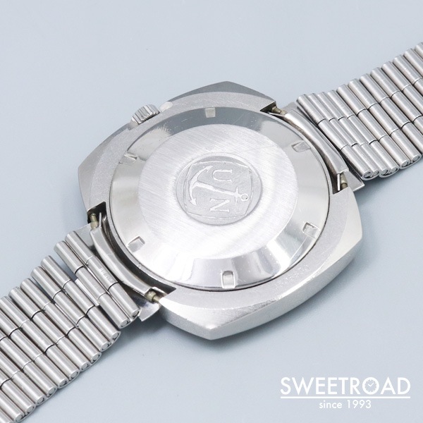船舶用クロノメーターの分野でほぼ独占状態になるほど成功し、50カ国の海軍に納入された歴史を持つ老舗時計メーカー「ユリス・ナルダン」。 非常に存在感のあるクッションケースが目を惹くクロノメーターモデルが入荷しました。 当時の純正BOX・ステンレスベルトが付属するグッドコンディションな個体で、コレクションにも実用にもオススメ出来ます。 文字盤、外装共に目立つようなダメージもなく、年式から考えても良好な状態を維持しています。 裏蓋のイカリマークもくっきりと残っています。 ムーブメントには自動巻クロノメーター「Cal.M11MJ」を搭載。目立った錆や劣化もなく、比較的綺麗な状態です。