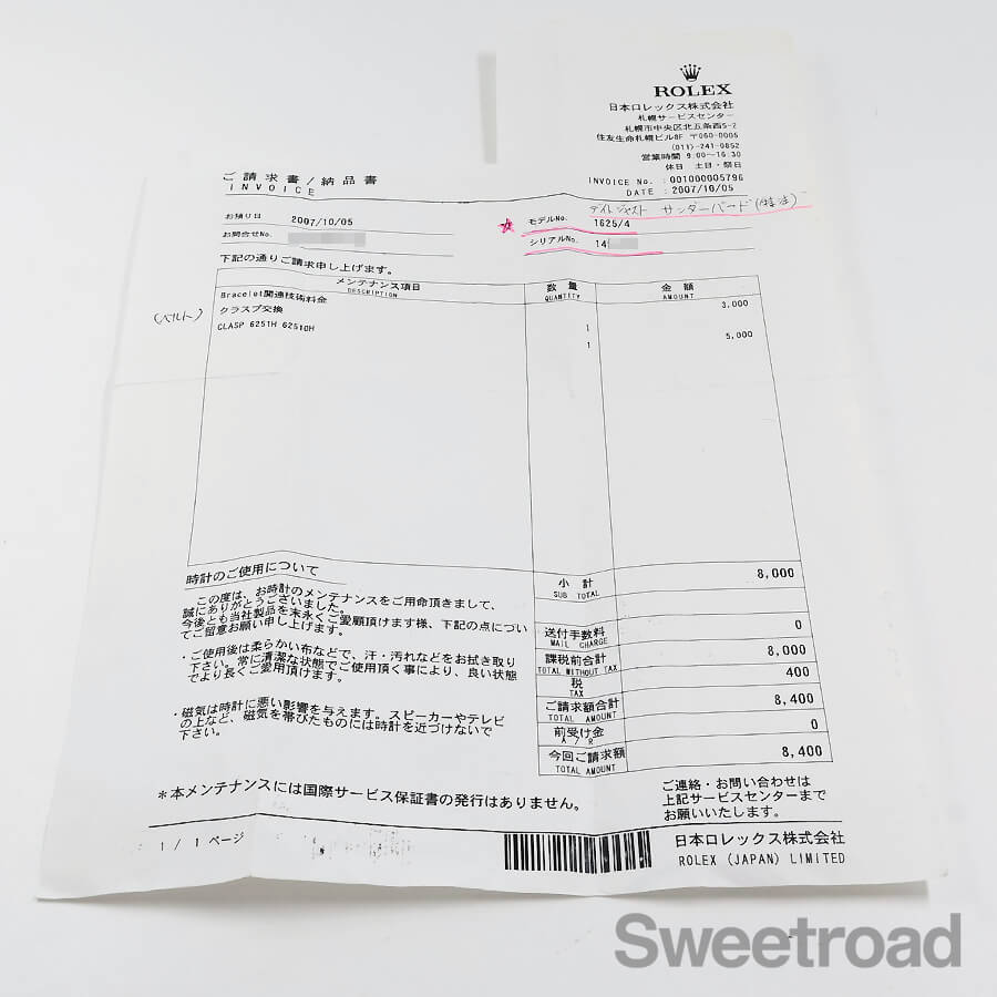 2007年5月に行われたメーカー修理納品書が付属し、メンテナンスの際にクラスプが交換されています。