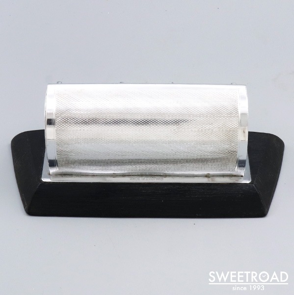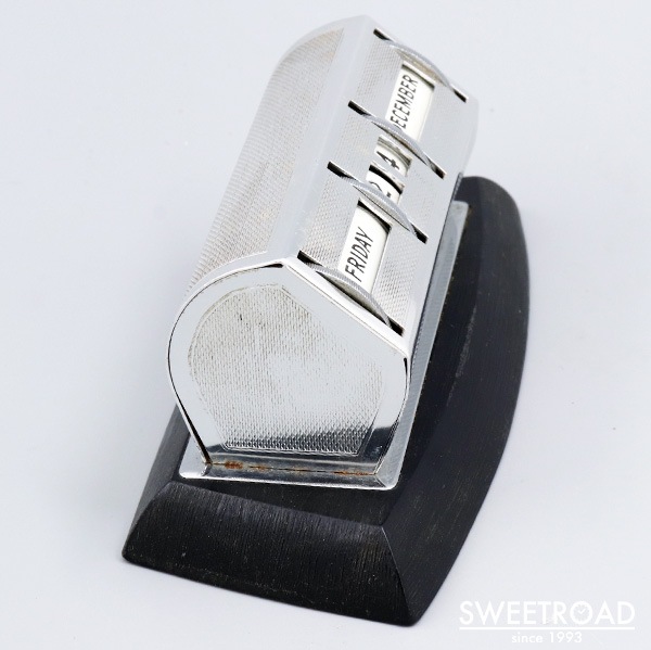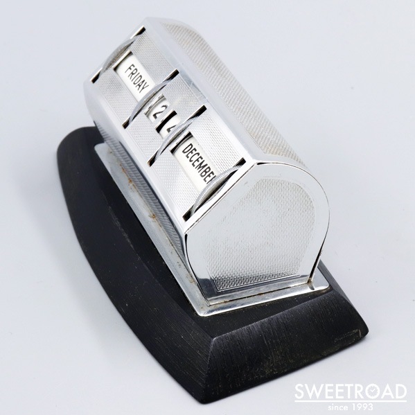 背面にMADE IN ENGLANDと刻印が入った、イギリス製のパーペチュアル・デスクカレンダーが入荷しました。 ボリュームのある台座が付けられた珍しい個体です。 シンプルで洗練されたスタイリッシュなデザインのヴィンテージらしいアイテムで、机の上に置きやすいモデルです。 前面のダイアルを回すだけで「月・日付・曜日」が変更できる、シンプルながら永久に使用できる逸品です。 若干の小傷がございますが、底面のフェルトはしっかりと残っており、全体的にコンディション良好と言える個体です。
