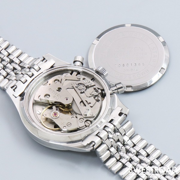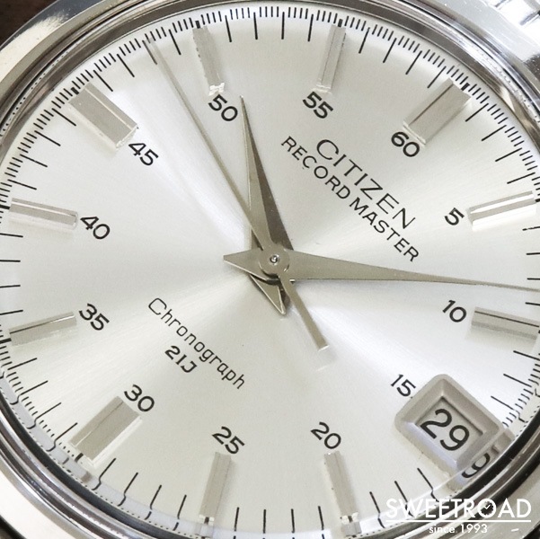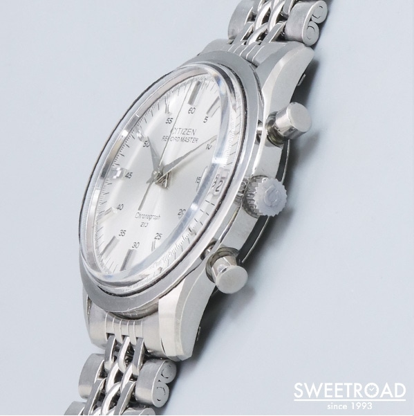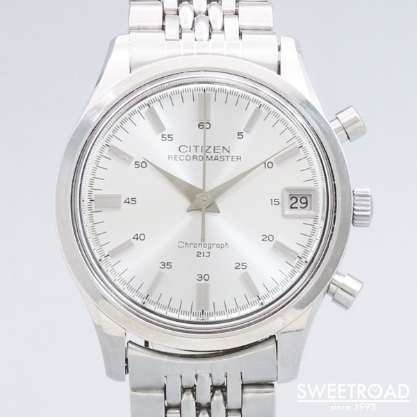 シチズン初のクロノグラフ「レコードマスター」が入荷しました。 1967年から約5年間生産されており、生産数の少ない事からアンティークシチズンの中でも5本の指に入る希少なモデルと言われています。 光沢のあるシルバーダイヤルにシャープな針・インデックスが配された高級感のある顔立ち。 ミニッツメモリがインデックスの外側に配されているので、文字盤が大きく見えます。 外装には小傷程度で、ケースエッジがしっかりと立った良コンディションを保っています。 裏蓋の刻印もはっきりと残っています。 ベルトは貴重なシチズン純正のジュビリーブレスが装着されています。 ムーブの状態も良く、錆や傷みは見れらません。 当時としては珍しい垂直クラッチや、フライバック機能を搭載した本格的な作りをしています。 非常に人気の高いモデルですので、お探しの方はお早めにご検討ください。