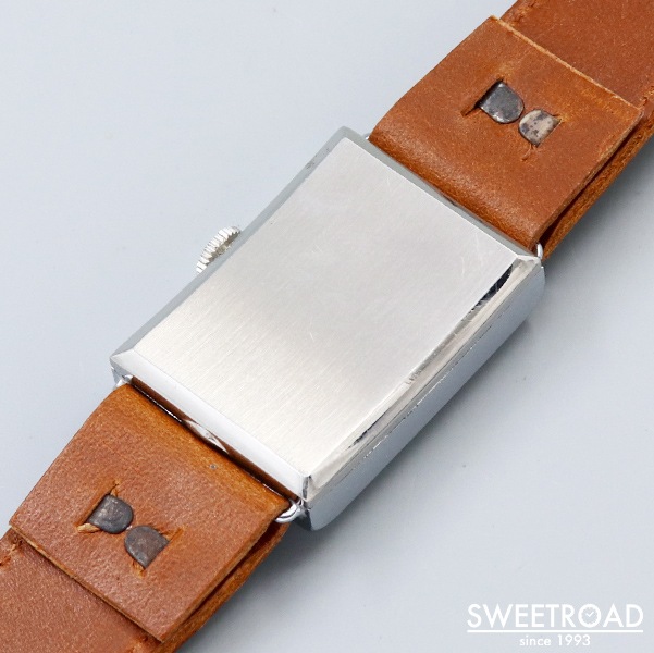 本商品は、アンティークらしさが随所に見られる希少性の高い逸品です。 スクエア型のダイヤルに全アラビア数字インデックスやスモセコ、ブルースチールの針が配されており、夜光に経年が現れてはいますが綺麗なコンディションを保っていると言えます。 ケースも角形ながら風防やラグに向かう上下には滑らかなカーブが設けられており、非常にバランス良く仕上がっています。 バネ棒式ではなくパリス管式となっていますので、ベルト交換の際はご注意ください。 ベルトは、ヴィンテージモデルに相性抜群な「Accurate Form(アキュレイトフォルム)」のレザーベルトを装着しています。