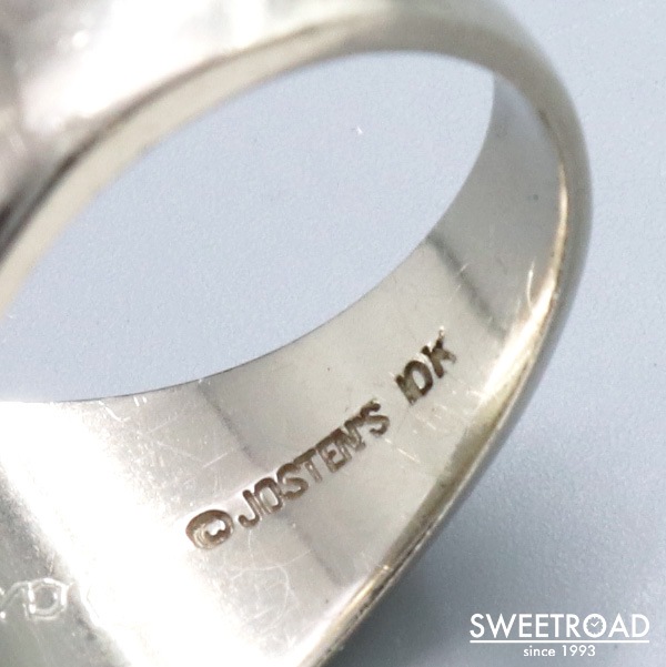 滑らかなディティールが特徴的な珍しいデザインが採用されており、センターの石部分が一段上がった存在感のあるモデルです。 石の上には「天秤」のモチーフ、リングサイドに「JD」と刻印がありますが、これは法務博士を修了した学生に授与される学位で、極めて優秀な生徒だったことがわかります。
