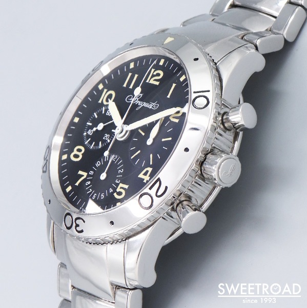 フランス海軍航空部隊のために1950年代に設計された「タイプXX」を民間用の現代ウォッチとして蘇らせたアエロナバル。 ブレゲらしいクラシックなデザインと高い視認性、そして上品なディテールを備えながらも、日常使いに耐えうるタフネスさも備えているため、オン・オフを問わず活躍してくれるオールマイティーなモデルです。 クロノグラフには飛行中の連続した時間計測のために必要とされたフライバック機能を搭載。 インダイヤルの機能は、3時側/30分積算計(1メモリ2分)、6時側/12時間積算計、9時側/スモセコ。 全体的に綺麗なコンディションを保っており、風防やベゼルにも目立つような傷は見られません。 ブレスは脱着のしやすい純正ステンレスブレスを装着しており、全長約20.0cmと長さも十分にございます。 付属品も残っていますので、コレクションにもオススメです。(ケースの蓋はロックできません。) 「時計の進化を2世紀早めた男」「時計界のレオナルド・ダ・ヴィンチ」など様々な賛辞を受けたブレゲの情熱を感じられる逸品です。