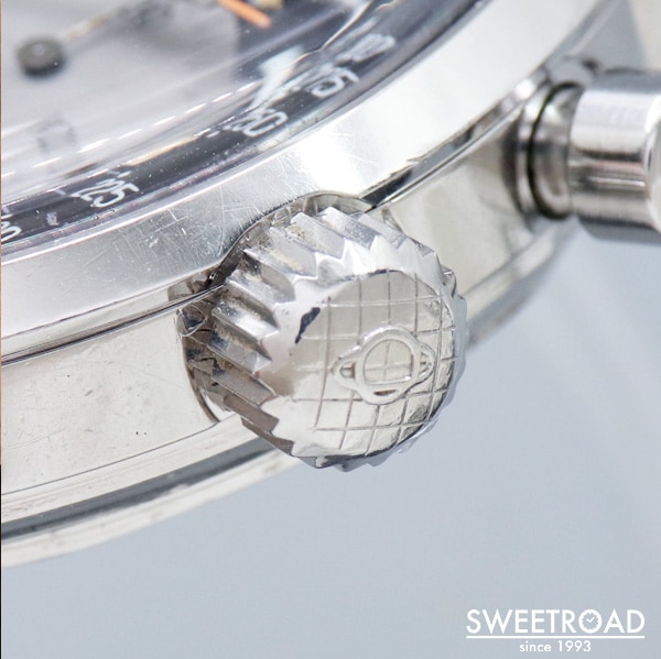 マットブラックのダイヤルに、グレーのインダイヤルが配された落ち着いたフェイスデザイン。 ボックス型のインデックスや夜光、長方形のパドルスタイルの針など非常に個性的な特徴を備えています。 外周にはミラー仕様のタキメーターが装備されており、300km/hからスタートする珍しい目盛りも魅力的です。 若干の経年こそございますが、目立つような劣化やダメージの見られない良好なコンディションを保っています。