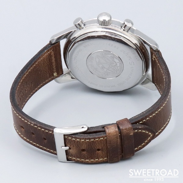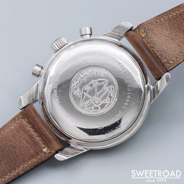 後年にポリッシュされた形跡がございますが、ケース痩せなどは見られず、裏蓋の刻印やシーパールが付いたSherpa300のロゴははっきりと残っています。 搭載のムーブメントはゴールデンフィニッシュされた手巻きクロノグラフ「バルジュー72」。 ROLEX・ポールニューマンやブライトリングのナビタイマーにも搭載されている名機です。
