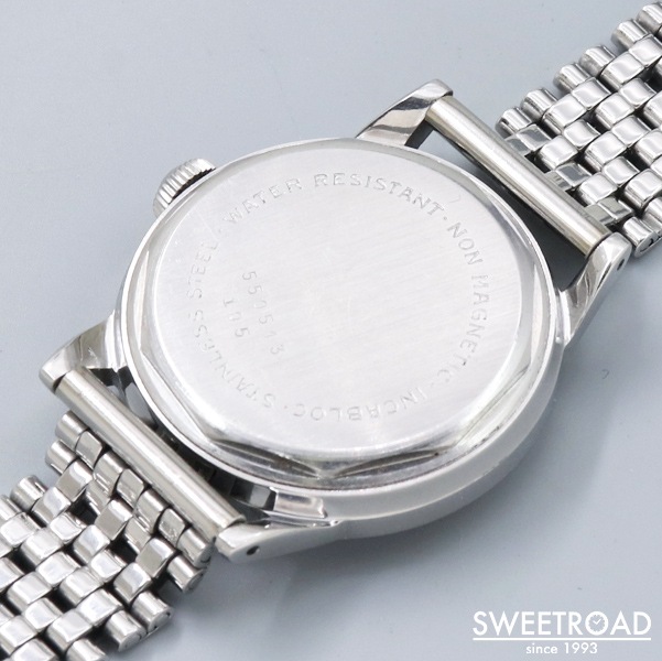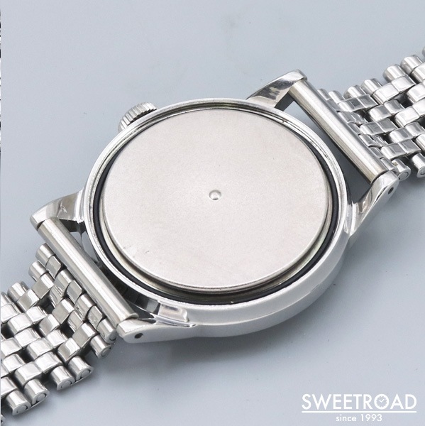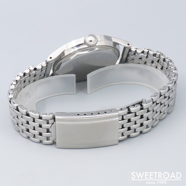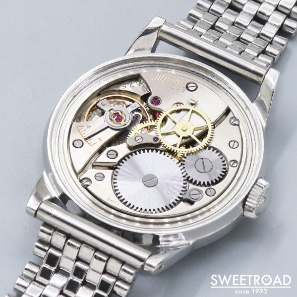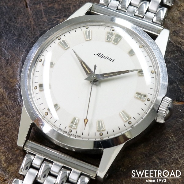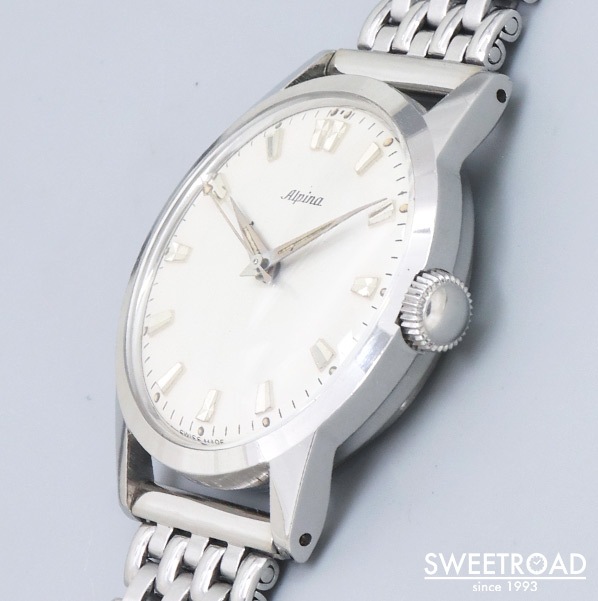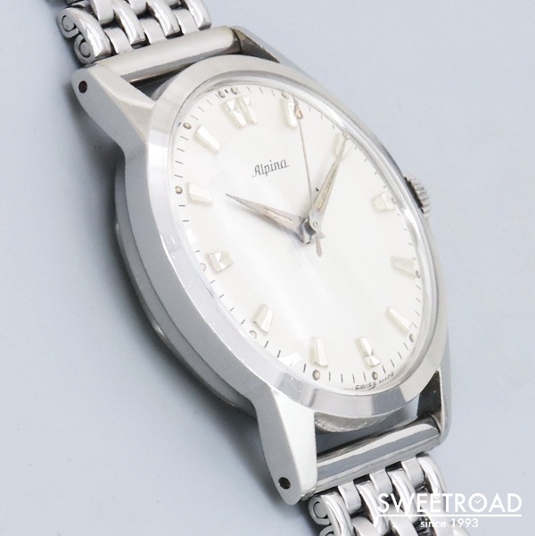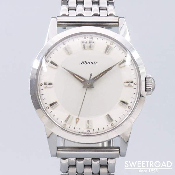 1883年にスイスのジュネーブにて創業した、130年以上の歴史を誇る高級時計メーカー「Alpina(アルピナ)」。 異なる仕上げで表現されたツートンダイヤルに、ドルフィンハンドや立体的なインデックスが目を引く個体です。 ダイヤルコンディションは非常に良く、針・インデックスには経年がございますが、目立つような過度な劣化は見られず、夜光の焼け具合は抜群です。 ベゼルの角度と合うドーム型の風防も魅力的なポイントです。 ケースはフランソワ・ボーゲル(François Borgel)の特許による、スクリューバック構造の防水ケースが採用されています。 裏蓋の内側には「FB」のイニシャルと鍵のロゴマークが刻印されています。 若干の小キズはございますが、過度な磨きは入っておりません。 内部は防塵製、耐磁性を高める軟鉄のダストカバーが収められており、テンプに耐震装置インカブロックを用いた自社製ムーブCal.598を搭載しています。 ブレスは、ヴィンテージモデルに相性が良い、プライベートアイズ製のライスブレス(全長約19.8cm)を装着しています。