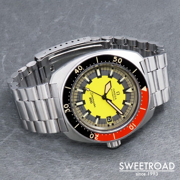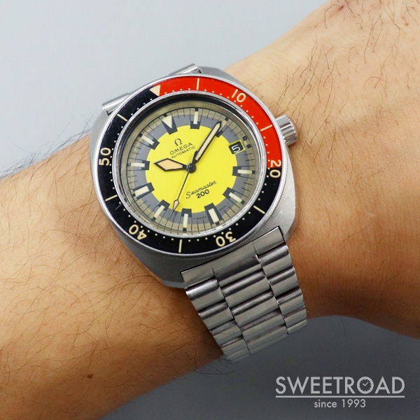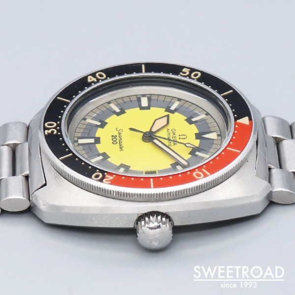 絶妙な色合いをしたイエローダイヤルと赤黒の回転ベゼルが目を引く、オメガ・シーマスター200が入荷しました。 そのルックスからマニアの間では「BANANA/バナナ」の愛称で親しまれています。 文字盤には経年によるエイジングが現れているものの、雰囲気を損ねるような過度な劣化などは見られず、バランスよく焼けた夜光と相まって非常にヴィンテージらしい顔に仕上がっています。 ケースにも経年による若干の使用感がございますが、エッジやボリューム感はしっかりと残っており、ベゼルもスムーズに可動いたします。