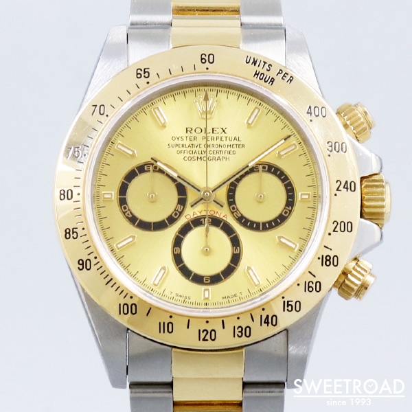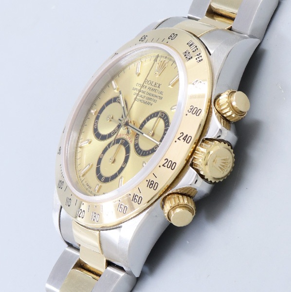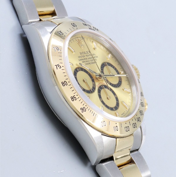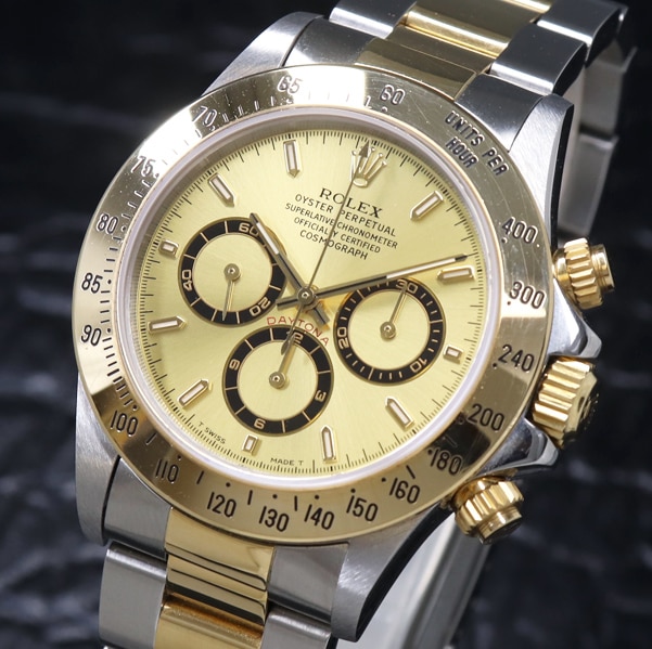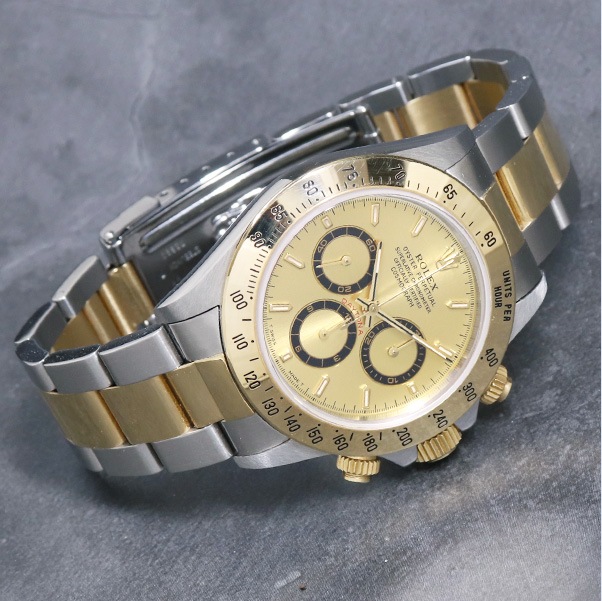 様々なダイヤルバリエーションがあることでも知られていますが、本商品はコンビ仕様のケースと相性の良いシャンパンダイヤルが採用された個体です。 ブラックカラーのインダイヤルと相まって、格好良さと高級感が抜群です。 インデックスと針にはトリチウム夜光が使用されており、6時位置の表記も「T SWISS MADE T」となっています。 薄くはなっていますが、裏蓋には当時のメーカーシールが貼られたままの状態です。 搭載されているムーブメントCal.4030は、傑作自動巻クロノムーブと謳われるゼニス社「エル・プリメロ」をベースにさらなる耐久性を求め、もともと毎時36,000振動だった振動数を毎時28,800振動まで抑え、テンプを大きくしマイクロステラナットで精度を高めるといったロレックス独自の改良が施されている。 ブレスはダブルロック・バックルが取り付けられた、コンビ仕様の純正ハードブレスが装着されています。 計12コマ、全長約19.5cmと長さも十分です。