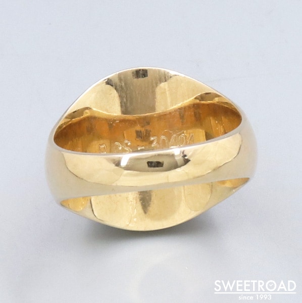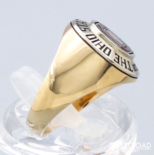 1870年に設立された、名門「オハイオ州立大学」のカレッジリングが入荷しました。 中央には赤い石で頭文字が配され、ベゼルには太く存在感のある校名が刻印されています。 全てが金無垢、または銀無垢という個体がほとんどで、ベゼルとリングが異素材のものは珍しい仕様になります。 年式の刻印がございませんが、コンディションからみてそれほど古いものではないかと思います。 有名な大学ほど卒業したということが名誉になるため、大学がモデルになったカレッジリングのほとんどは出回ることがありません。どのような経緯で手放してしまったのか、非常に気になるところでもあります。
