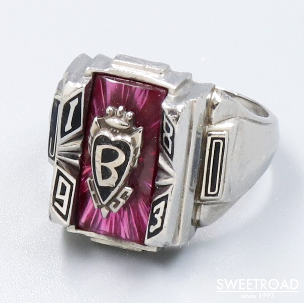 雰囲気の良いスクエア型のカレッジリングが入荷しました。 カッティングが施されたレッドカラーの石に「B」と大きく書かれたエンブレムが輝く個性的な個体です。 製造は創業120年を誇る米国最大の記念品製造メーカー「ジャスティン」製。若干の使用感がございますが、とてもヴィンテージらしい雰囲気に仕上がってると言えます。