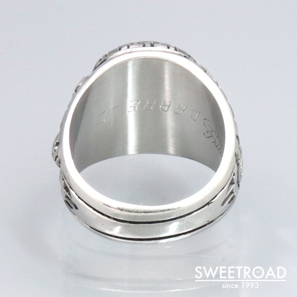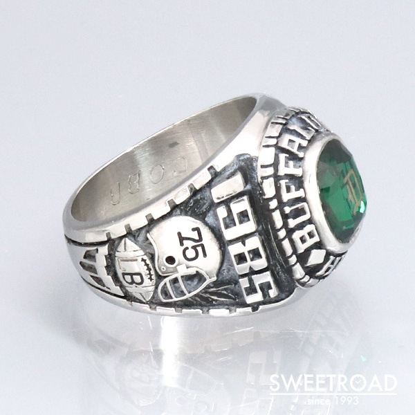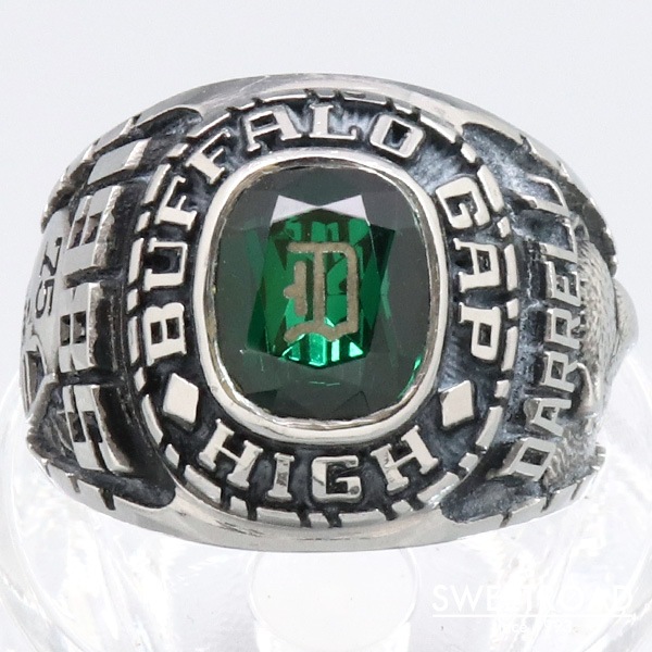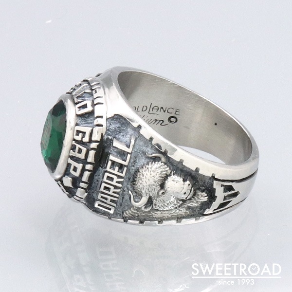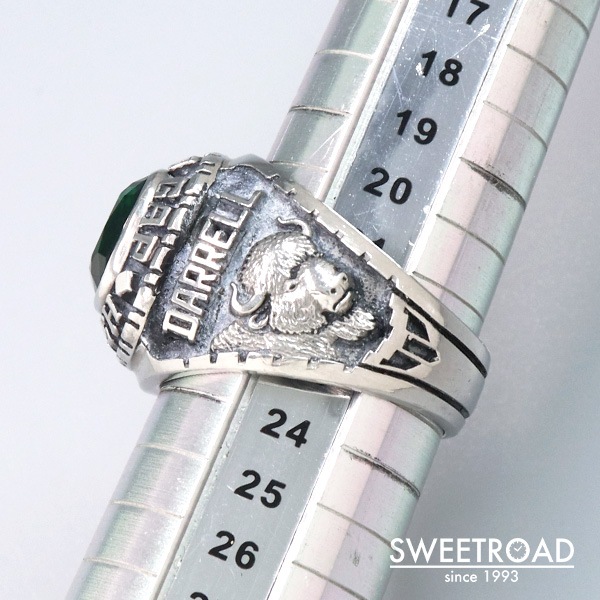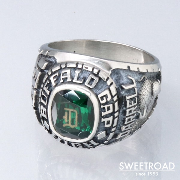1962年に創設されたバージニア州スウォープにある「BUFFALO GAP HIGH SCHOOL/バッファロー・ギャップ高校」のカレッジリングです。 アメフトに力を入れていた1985年の卒業生のものと思われる彫り込みがデザインされています。 グリーンの石に「D」のイニシャルが刻印された珍しい個体です。 製造はGOLD LANCE社。 ベゼルやリングサイドが深く掘り込まれており、非常に存在感があります。 若干の小傷がございますが、目立つような劣化などが見られない良好な状態を保っています。