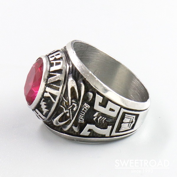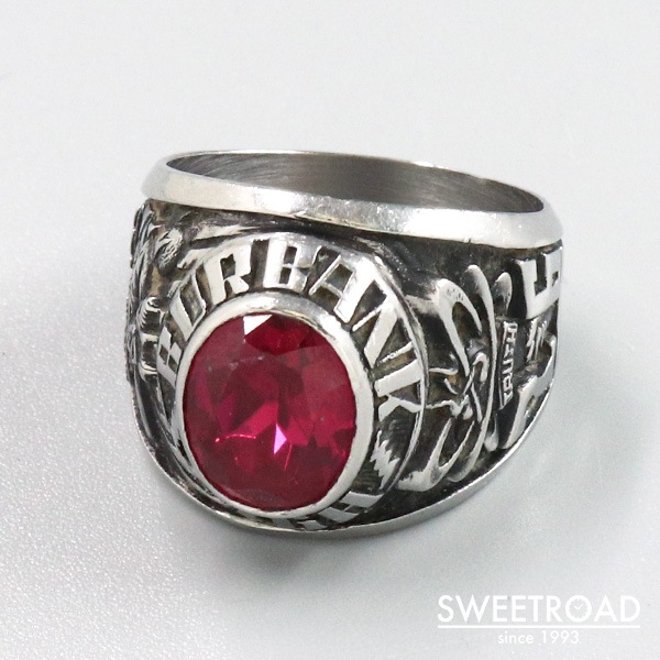 1908年に設立されたカリフォルニア州バーバンクにある「BURBANK HIGH SCHOOL/バーバンク高校」のカレッジリングが入荷しました。 1976年の卒業生が制作したと見られる個体です。 ベゼルやリングサイドが深く掘り込まれており、非常に存在感があります。 石などに若干の小傷がございますが、ヴィンテージらしい風合いが非常に良く現れています。