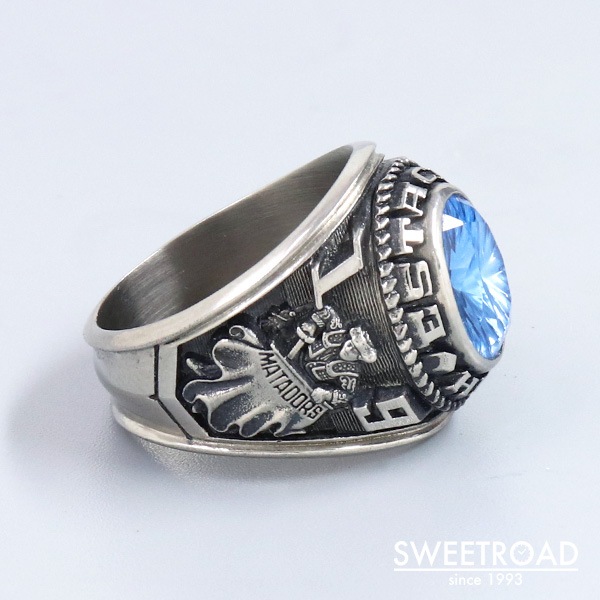 1967年設立されたテキサス州ラボックにある「ESTACADO HIGH SCHOOL/エスタカド・ハイスクール」のカレッジリングが入荷しました。 1988年の卒業生が制作したと見られる個体です。 リングサイドには学校のマスコットでもある「マタドール」のイラストが掘り込まれており、非常に存在感があります。 石には目立った傷みは見られません。