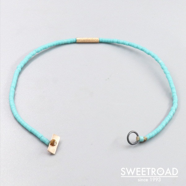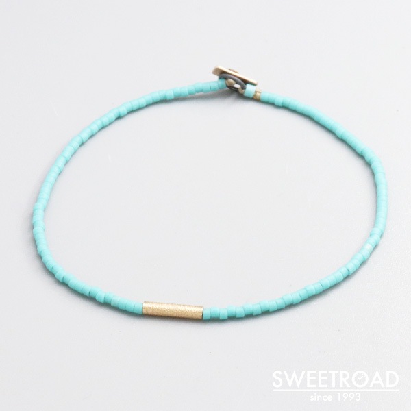ストックホルムを拠点とするジュエリー会社「Oskar Gydell(オスカーガイデル)」が製作したビーズブレスレットです。 スカイブルーのビーズに、ゴールドチューブが組み合わさったデザイン性の高いモデルです。 素材は日本のトーホー(TOHO)ビーズが製造している高品質のグラスビーズが使用されています。