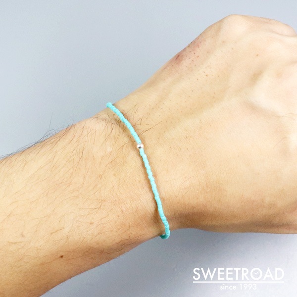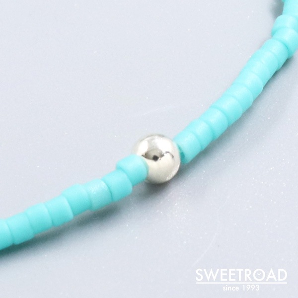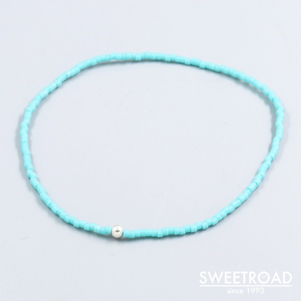 ストックホルムを拠点とするジュエリー会社「Oskar Gydell(オスカーガイデル)」が製作したビーズブレスレットです。マットターコイズブルーのビーズと、925シルバーのオーブが組み合わさった爽やかなモデルです。 日本のトーホー(TOHO)ビーズが製造している高品質のグラスビーズが使用されています。 ゴム紐仕様ですので脱着がしやすいのも特徴です。