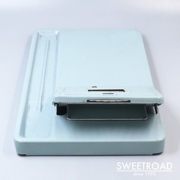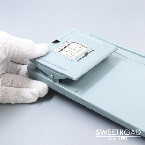 スチール製のバインダーに手動式の万年カレンダーが付加されたヴィンテージアイテムです。 戦後1950年代頃に製造された日本製のモデルで、裏面に「JAPAN」と刻印が配されています。 月を上のダイアルで切り替え、下のつまみで曜日と日付を合わせる仕組みなっています。 経年による傷みこそございますが、メモを挟んだり、ペンを置いておけるなど、中々実用的な逸品です。