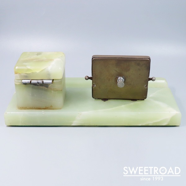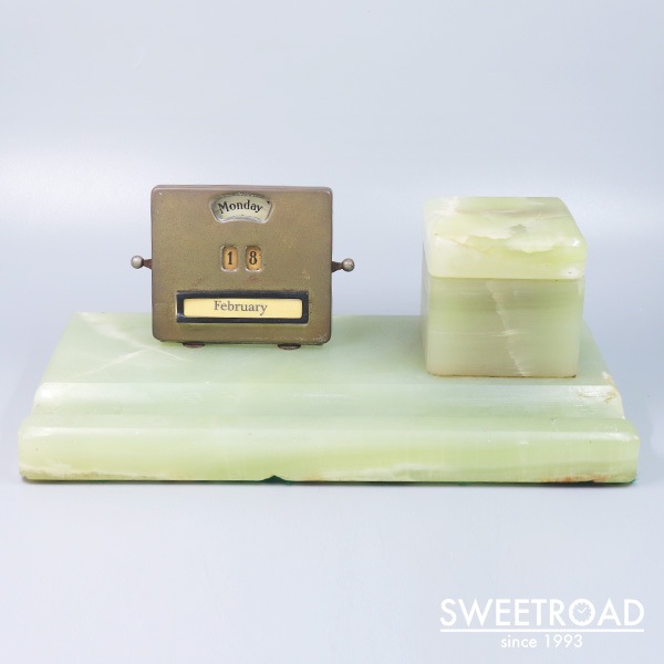 ヴィンテージ・デスクカレンダー D.R.G.M. ドイツ製 グリーンオニキス インク壺付き 1930年代 w-26309