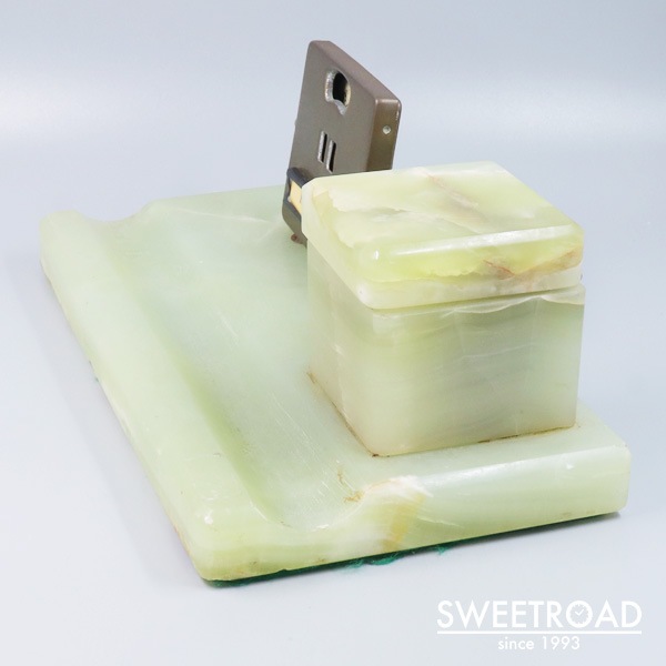 カレンダーの隣にはベースと同じくグリーンオニキスで作られた箱の中に、陶器製のインク壺が設置されています。 ヴィンテージ品のため密閉度はそれほど高くないかと思われますが、手前の溝に、万年筆やガラスペンなんかを置いて使ってみてください。 底面のフェルトも残っており、良好なコンディションを保っていると言える逸品です。