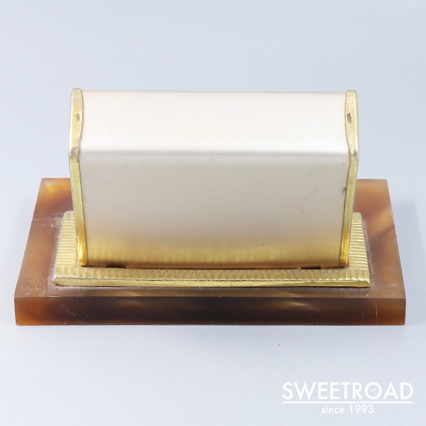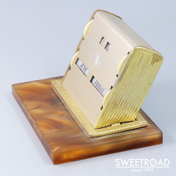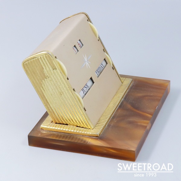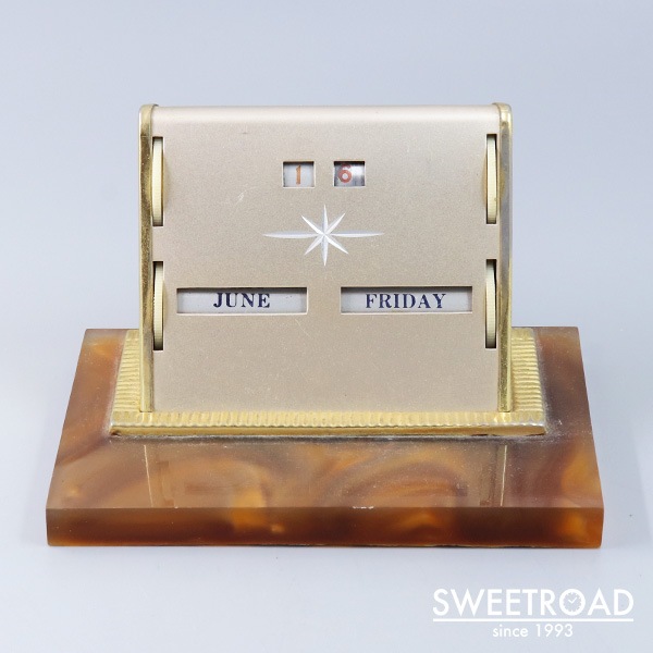 1960年代頃に製造されたヴィンテージ・デスクカレンダーです。 両サイドのダイヤルを回すことで「月・日付・曜日」の変更ができる、シンプルながら永久に使用できる仕組みです。 日付表示に経年による掠れが見られますが、判別は可能となっています。 台座は樹脂製、ボディはメタル仕様ですので、扱いやすい逸品です。