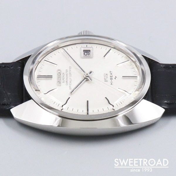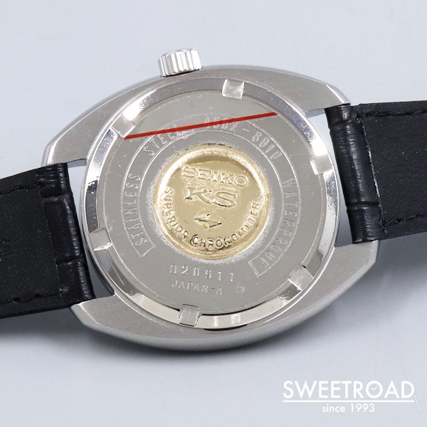 - 国産時計初の「公認クロノメーター」を所得した「キングセイコー/45KS」。 12時位置に「CHRONOMETER(クロノメーター)」だけでなく、「高級・上質」を意味する「SUPERIOR(スーペリア)」の表記も配された希少な個体が入荷しました。 キングセイコーを製造していた亀戸精工舎が、グランドセイコーの諏訪に劣るものではないことを示すために、当時の技術力を注ぎ込んだモデルです。 ケースとラグが一体となった特徴的なトノーケースが採用されており、手巻きムーブを搭載しているため裏蓋がフラットに着けやすくなっているのもポイントです。 裏蓋には亀戸精工舎マークの下に「SUPERIOR CHRONOMETER」と刻まれた専用のメダリオンが付いています。 文字盤中央と外周には経年により若干のシミが現れていますが、視認性を妨げるような過度な劣化は見られません。 ベルトは後年式のセイコー純正レザーベルトを装着しています。