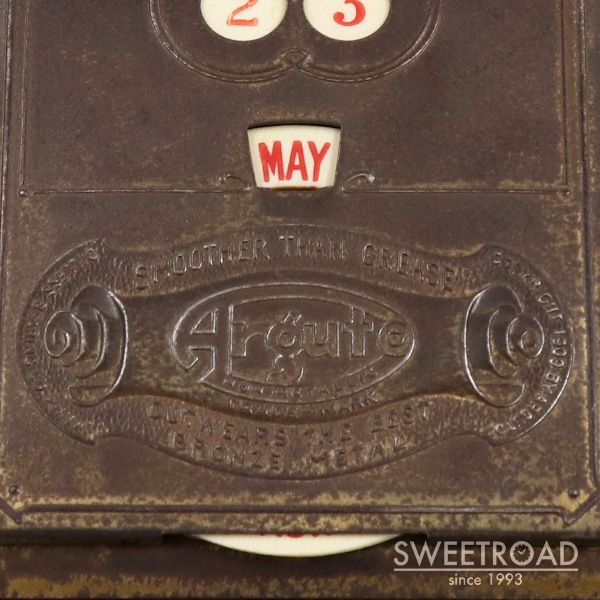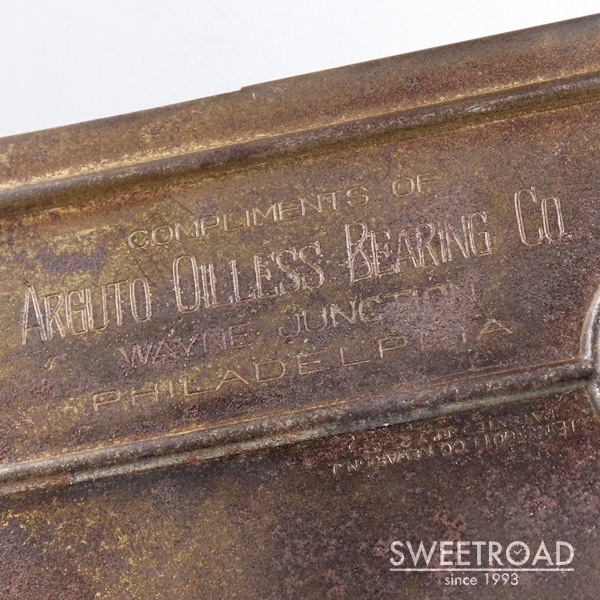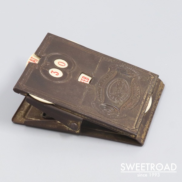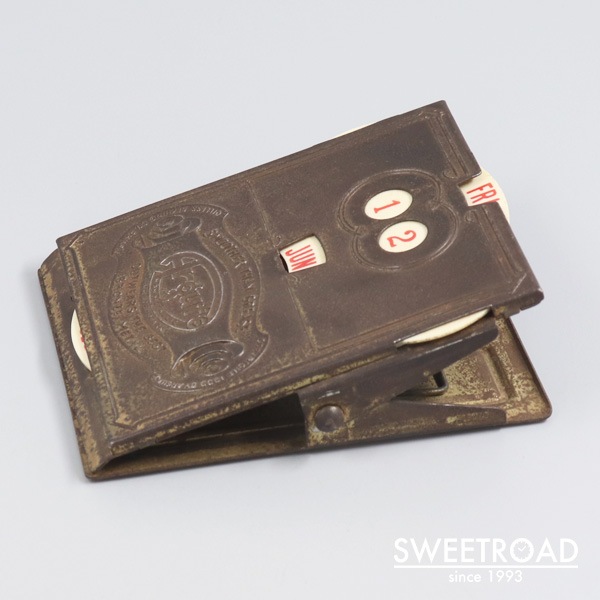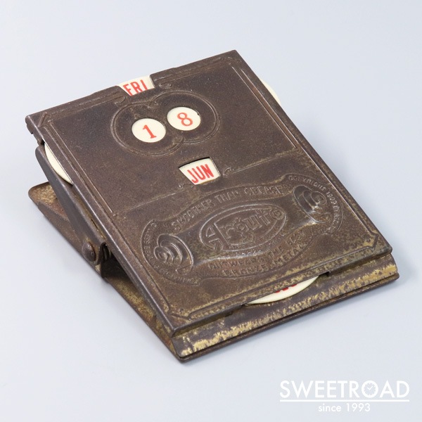 - 1940年代頃に製造されたクリップ式のヴィンテージカレンダーが入荷しました。 真鍮のボディに樹脂製のカレンダー板が配されたモデルで、経年による非常に雰囲気の良いエイジングが魅力的です。 フィラデルフィアにある「ARGUTO OILLESS BEARING CO」という会社が、記念品もしくは贈呈品として制作したモデルで、立体的なエンブレムや裏の刻印などが施されています。 サイズ感やバネの強さもちょうどよく、実用として申し分ない逸品です。