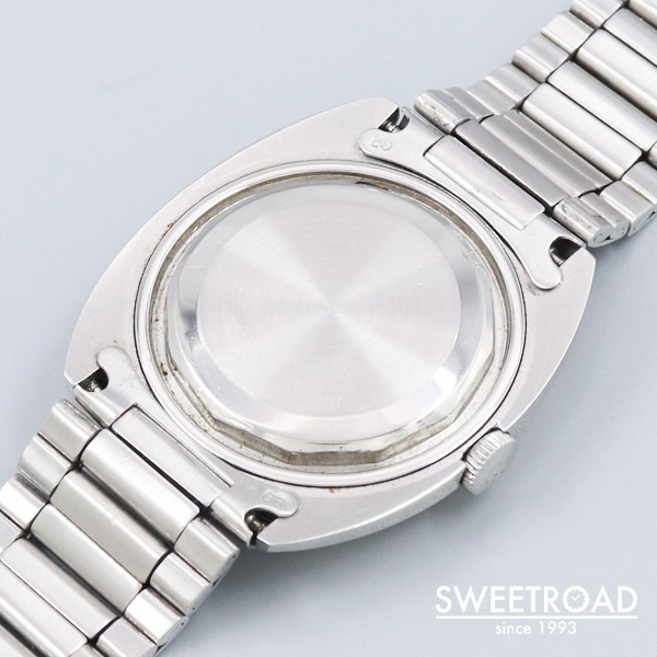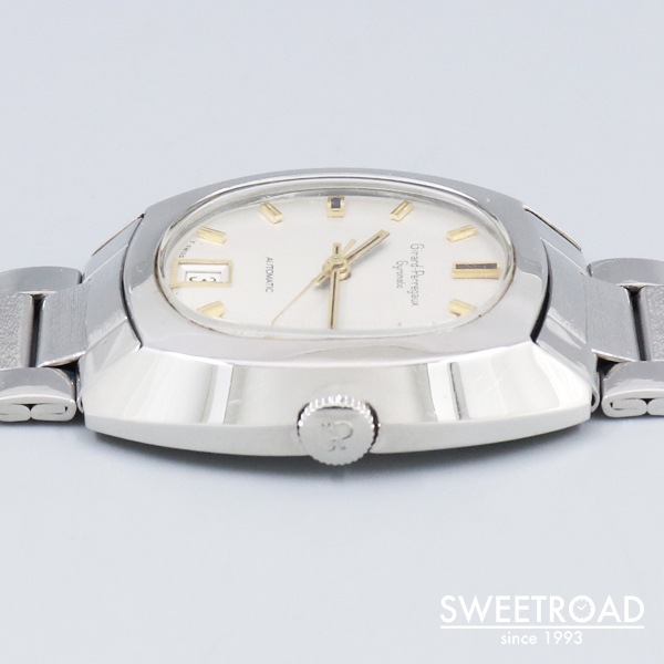 - 自社で一貫して全行程を製作する貴重なマニファクチュールブランド「ジラール・ペルゴ/ジャイロマチック」が入荷しました。 シャープなトノー型ケースに文字盤6時位置に特徴的なデイト窓が配された魅力的な個体です。シルバーダイヤルに高級感のあるゴールドのインデックスに目を惹きます。 3時インデックスの塗料が剥がれていますが、雰囲気を損なう程ではございません。外装に小傷はございますが、打痕や過度なダメージはございません。 ムーブメントは36,000振動のハイビート自動巻「Cal.29398」を搭載。 ベルトはゲイフレアー社製の純正ステンレスブレスが装着されており、全長18.5cmの状態です。