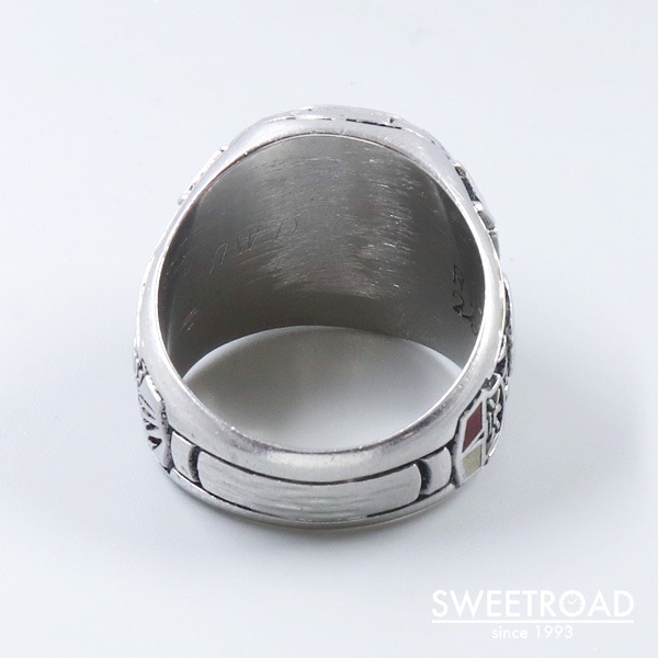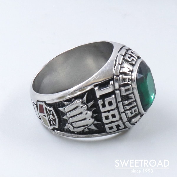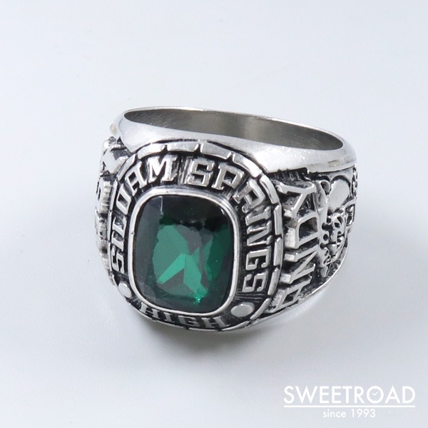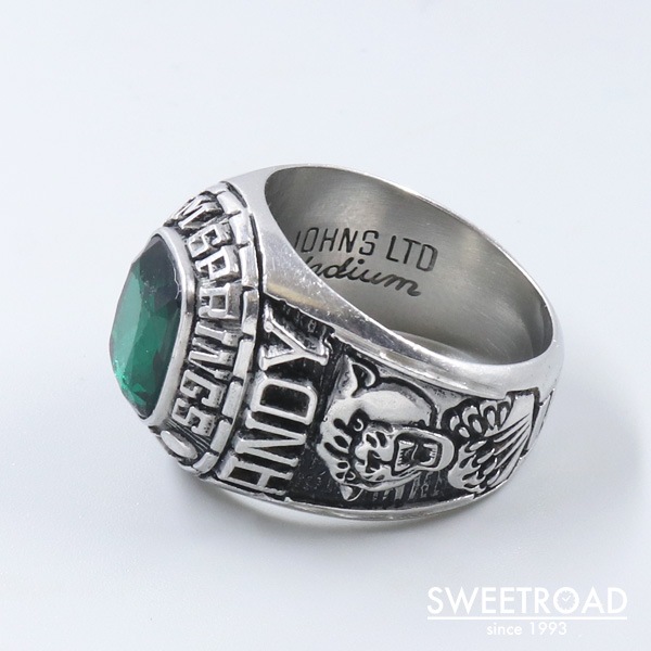 - 1986年に製造された雰囲気のあるカレッジリングが入荷しました。 アメリカ・アーカンソー州にある高校「シロアム・スプリング・ハイスクール」のモデルです。 ボリュームのあるスクエアクッション型のデザインが採用されたリングで、石に細かなカッティングが施されたデザイン性の高さが目を引きます。 リングサイドには学校のチーム名にもなっているパンサーと、力強い拳の刻印が掘り込まれています。 経年による小傷がございますが、ヴィンテージ感のある雰囲気が楽しめる逸品です。