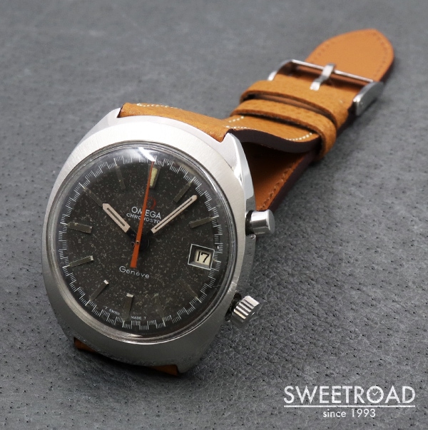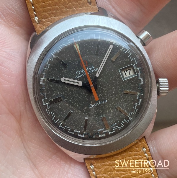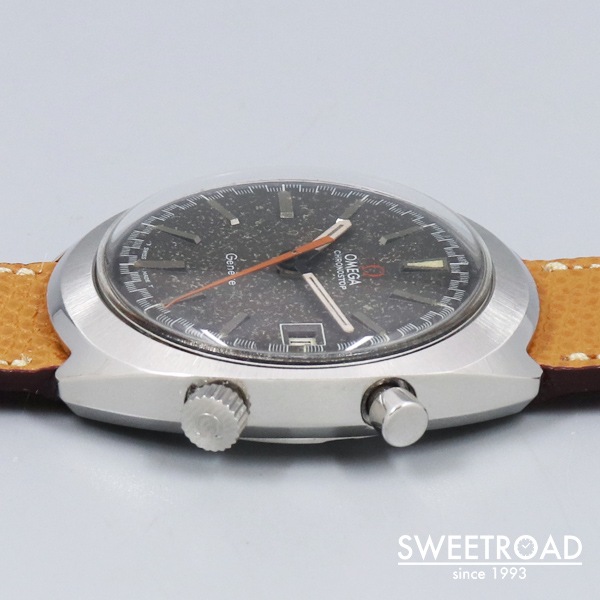 - オメガが手がけたユニークなクロノグラフ「クロノストップ」が入荷しました。 積算計を持たないワンプッシュ式の「クロノグラフ/Cal.920」を搭載しており、2時位置プッシャーを押してスタート、再度押してストップ、離すとリセットする仕組みになっています。 本商品は、視認性を高めるためにデザインされた、通称「レーシングダイヤル」と呼ばれるチェッカーフラッグ柄の特徴的なミニッツトラックを採用しています。 オリジナルのグレーダイヤルが経年により、模様のようなエイジングが現れておりヴィンテージらしい顔立ちが魅力的です。 外装には後年ポリッシュ仕上げが施されており、目立つような傷みはございません。裏蓋の刻印もしっかりと残った良好なコンディションです。 ベルトはヴィンテージモデルに相性抜群な「Accurate Form(アキュレイトフォルム)」のレザーベルトを装着しています。