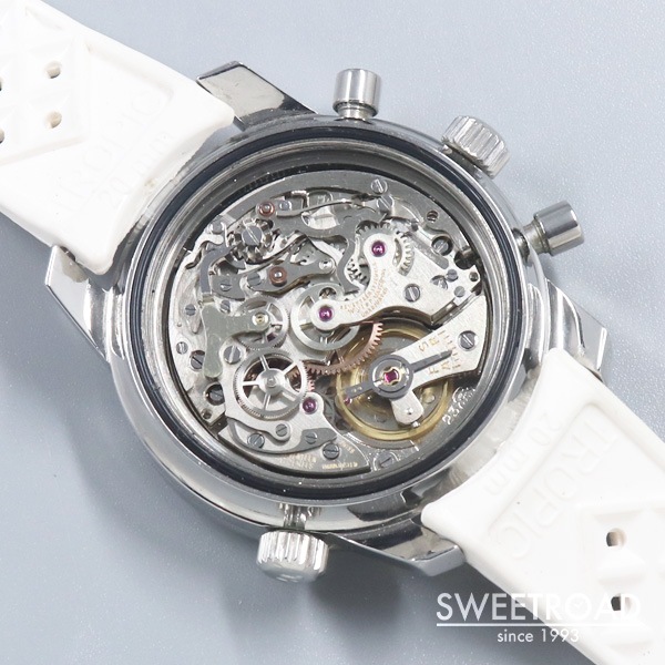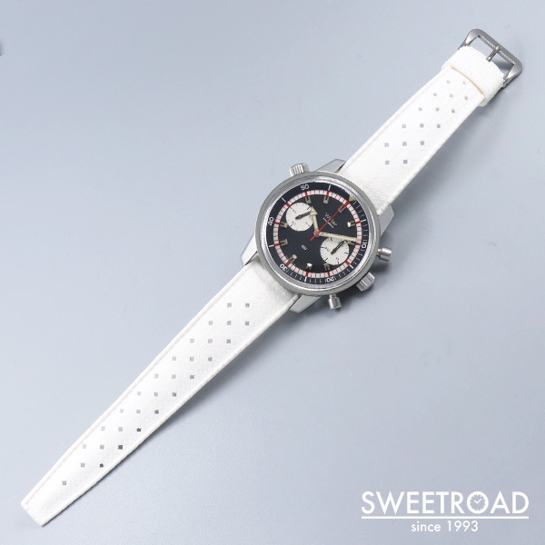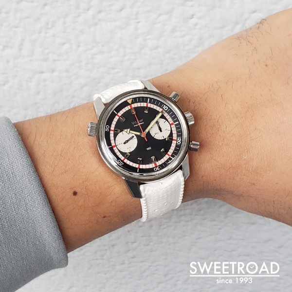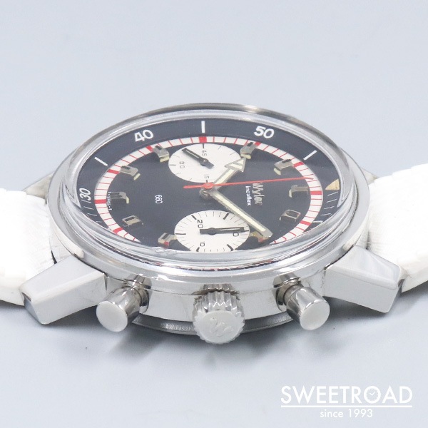 1968年に登場したダイバーズクロノグラフ、ワイラーの「Jumbostar/ジャンボスター」です。 6時位置にはモデル名の代わりに「660」と配されており、これは660フィート(約200M防水)ということを表しています。 ワイラー創立125周年を記念して復刻されたことで、注目度が上がっており、オリジナルの個体はなかなか出回っていません。 オリジナルのマットブラックダイヤルに、ダイバーズらしい針や回転インナーベゼルが採用されたヴィンテージらしい顔立ち。 針やインデックスの内側にはトリチウム夜光がそのまま残っており、当時の雰囲気を残しています。 ベゼルと風防の4時位置にわずかな傷みが見られるものの、過度な劣化などはございません。 バルジュー社の傑作「バルジュー23」に、ワイラー独自の「ワイラーテンプ」を組み合わせることで、非常に完成度の高いムーブメントに仕上がっています。 ベルトは、トロピック社のホワイトウレタンベルトを装着しています。