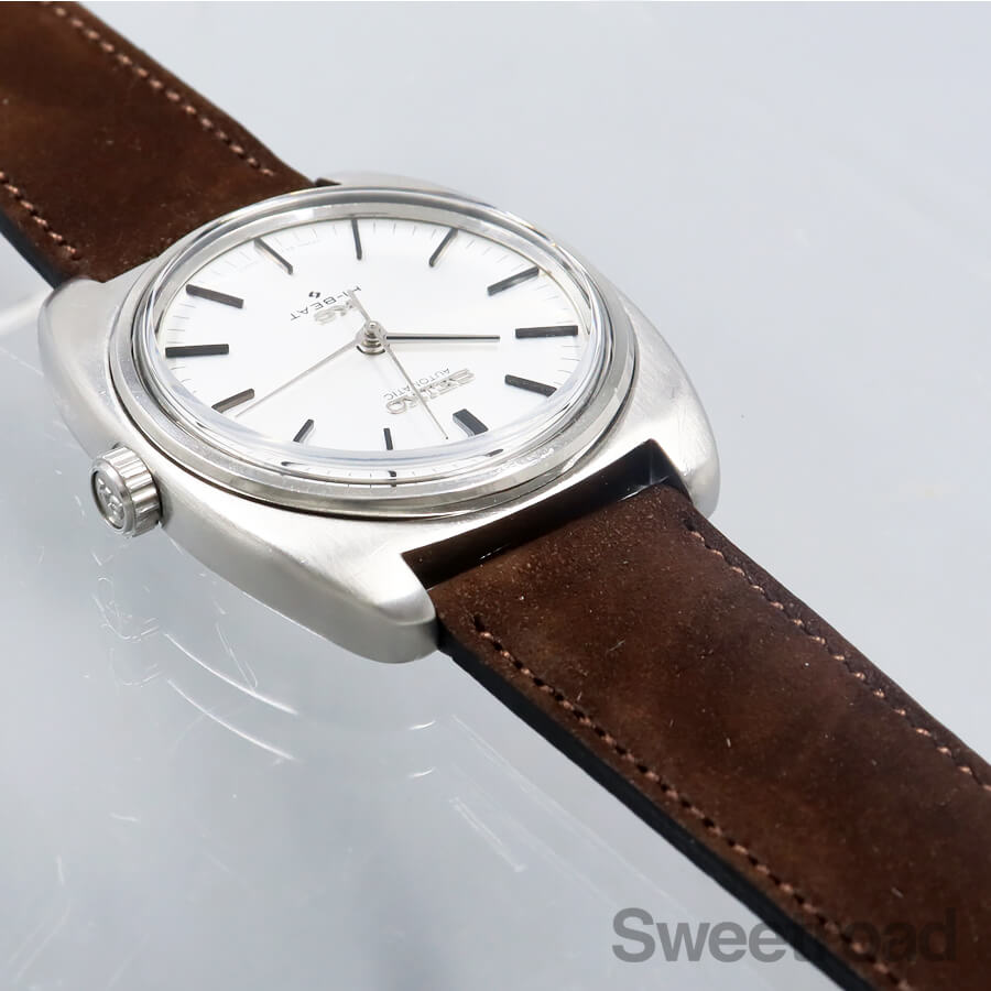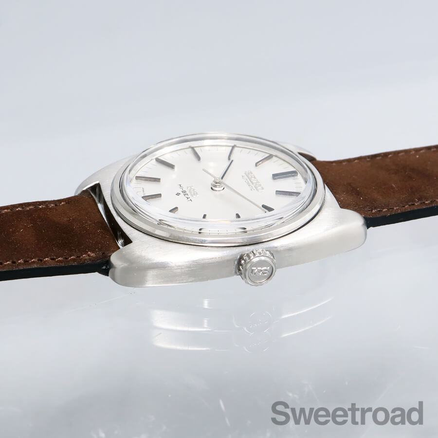 丸みを帯びたクッション型のワンピースケースが採用され、精度の微調整が行えるように「外部微動緩急調整」という機能が備わった、キングセイコーの中でも個性的なモデルです。