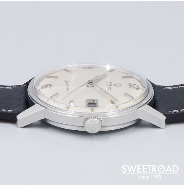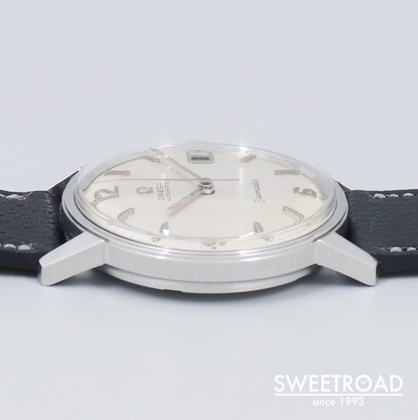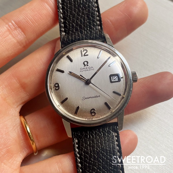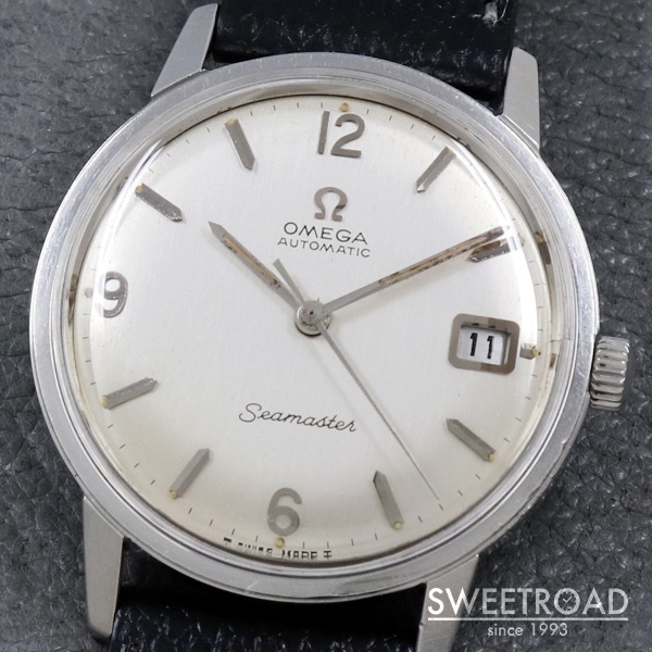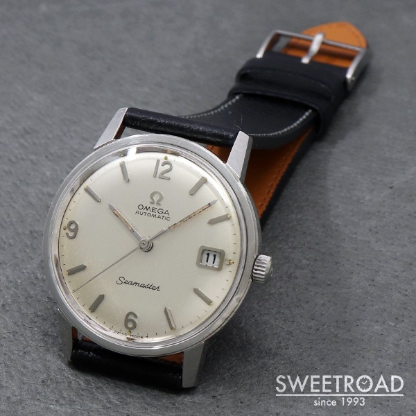 1968年に製造されたオメガの定番モデル「Seamaster/シーマスター 」のヴィンテージモデルが入荷しました。 本商品は、オリジナルのシルバーダイヤルに12・6・9のアラビア数字インデックスが配されたヴィンテージらしいデザインが目を惹く個体です。 文字盤には年式相応のエイジングが見受けられ、外周付近には点状の経年がございます。 外装には小傷や使用感が感じ取れますが、ケースエッジや裏蓋の刻印は綺麗に残ったオリジナルコンディションです。 ムーブメントは高級機に多く取り入れられているスワンネック緩急針を採用した「Cal.565」を搭載。 美しいコパメッキが施されており、自動巻ローターの巻き上げも良好です。 リューズ1段引きで時刻合わせ、リューズ2段引きでカレンダー切り替わるクイックチェンジ方式を採用しています。 ベルトは、ヴィンテージモデルに相性抜群な「Accurate Form(アキュレイトフォルム)」のレザーベルトを装着しています。