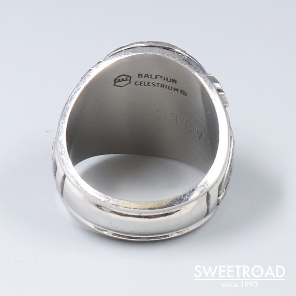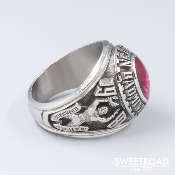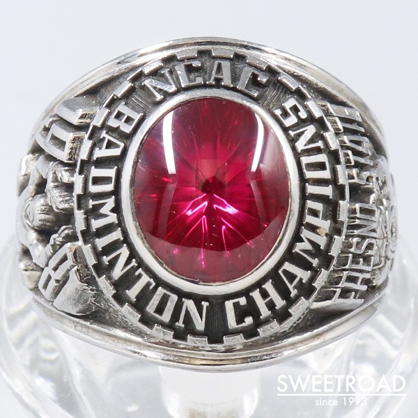 1981年に行われた「NCAC(ノースコースト・アスレチック・カンファレンス)」という大学のリーグ戦を優勝した記念に制作された、バドミントンのチャンピオンリングです。 カリフォルニア州立大学フレズノ校(一般にフレズノ州立大学と呼ばれる)のモデルで、リングサイドにはチームエンブレムのブルドッグや点数などは刻印されています。 センターにはオーバル型の赤い石がセットされており、表面は滑らかに、内側にはサンバーストカットが施された存在感のある逸品です。 大学かつチャンピオンリングというのは、あまり出回ることがないため、非常に希少性が高いアイテムです。 若干の小傷程度で、目立つようなダメージの見られない良コンディションを保っています。
