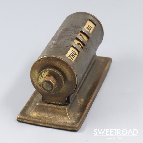 - 1930年初頭から1970年代頃まで存在したアメリカのブランド「Park Sherman/パークシャーマン」。 本商品は、ドラム式のデスクカレンダーで、スチールと真鍮が組み合わさった雰囲気のある個体です。 重厚感のあるデザインが魅力的で、経年により非常にアンティークらしいエイジングが現れています。 両サイドの摘みを回すだけで「月・日付・曜日」の変更ができる、シンプルながら永久に使用できる仕組みです。 カレンダーには経年による焼けが現れていますが、破れや読めない文字はございません。 底面のフェルトやパークシャーマンのシールもしっかりと残っています。