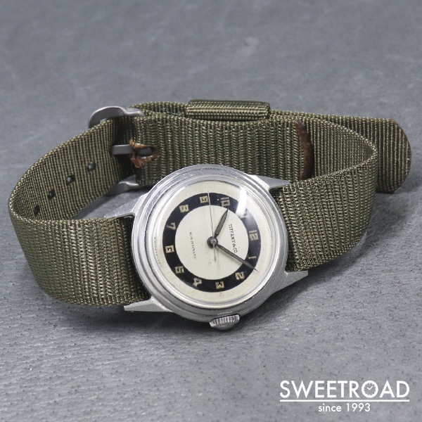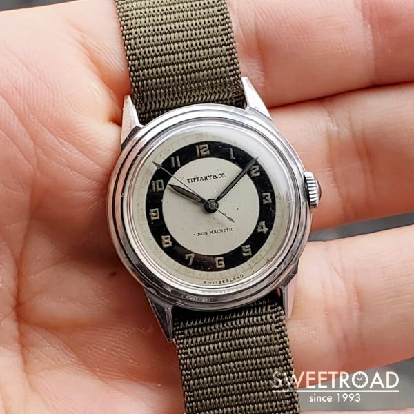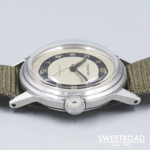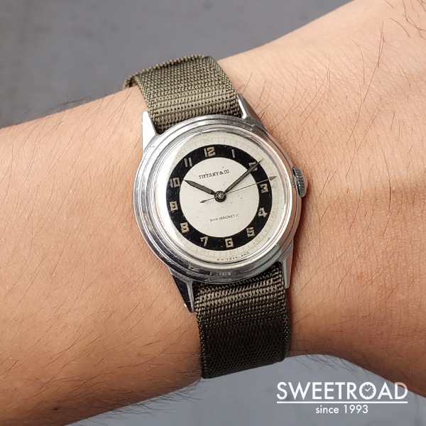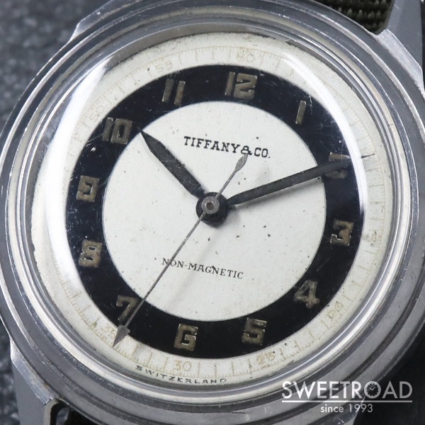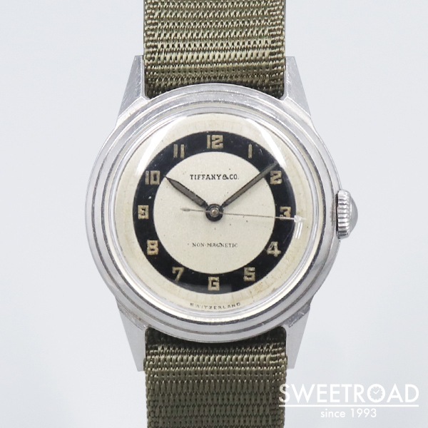 1940年代にMOVADO(モバード)が製造した、ティファニーの時計が入荷しました。 雰囲気よく経年が現れたミラー感のあるブルズアイダイヤルに、ペンシルハンドやアラビア数字のインデックスが配されたヴィンテージらしい顔立ち。 秒針の先端が三角になっているのも魅力的です。 文字盤外周などに若干の傷みが見られますが、致命的な剥がれや凹みなどはございません。 ケースはモバードではお馴染みのFBケースが採用されています。 パテック・フィリップにも供給していた「Francois Borgel」社によるもので、鍵とFBが組み合わさったマークが裏蓋の内側に刻印されています。 スクリューバック仕様かつ耐磁板が備わった二重裏蓋構造という、しっかりとした造りが感じられる逸品です。 ムーブメントはモバード製のCal.470を搭載しています。 目立つような劣化などは見られず、良好な状態を保っています。 バネ棒式で横穴も開いているので、ベルト交換も比較的容易に行えます。 ケース径30ミリと小ぶりながら、存在感のあるヴィンテージモデルです。