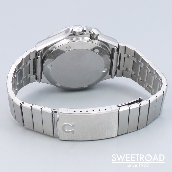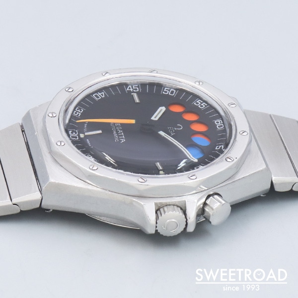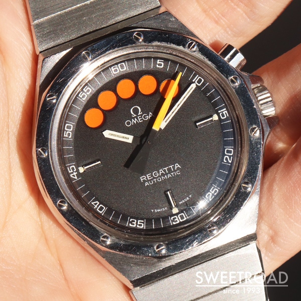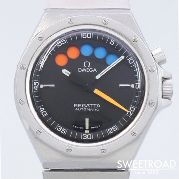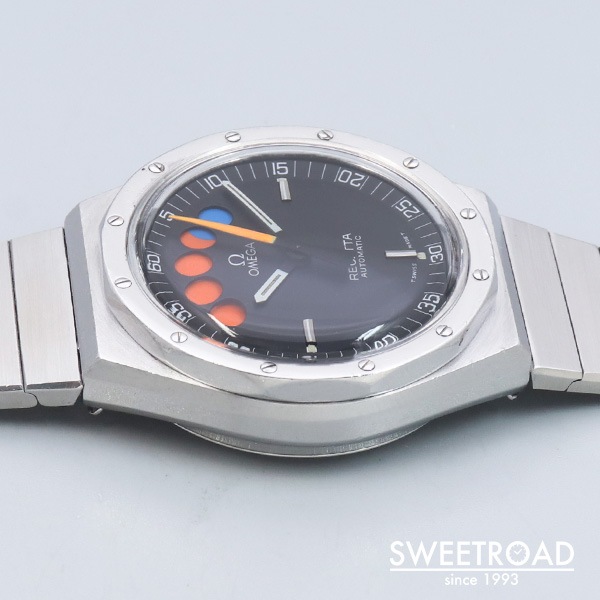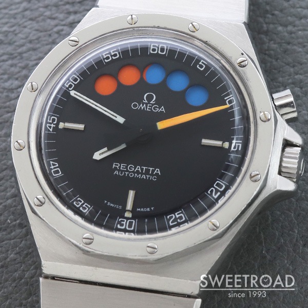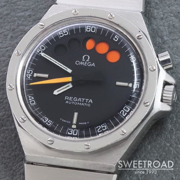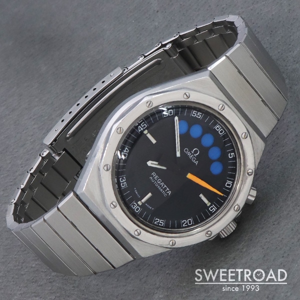 - 1979年に製造されたオメガの希少モデル「レガッタ」が入荷しました。 市場でも全く見かけることのない非常に珍しいモデルで、ヨットレース用に特別に設計されています。 2時位置のプッシャーを押すと秒針が瞬時に0時位置に戻り、クロノグラフが起動します。 同時に5つのインジケーターが青色に切り替わり、1分毎にオレンジに変わっていき、5分後にはブラックに切り替わります。 合計10分間を測定することができ、色によって経過時間を瞬時に判断出来るというヨットレースのために設計されたモデルです。 文字盤はオリジナルのマットブラックダイヤル。 目立つ劣化や傷みのない非常に綺麗なコンディションを保っています。 外装には年式相応の小傷や使用感が見受けられますが、エッジや裏蓋の刻印は残っており、ボリューム感も健在です。 ムーブメントはレマニア社の「Cal.1345」を搭載。 ベルトはオメガ純正の1連ステンレスブレスを装着しており、全長20.5cmの状態です。 バックル部分には特殊な仕上げが施されています。