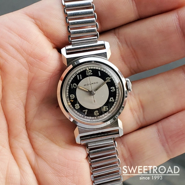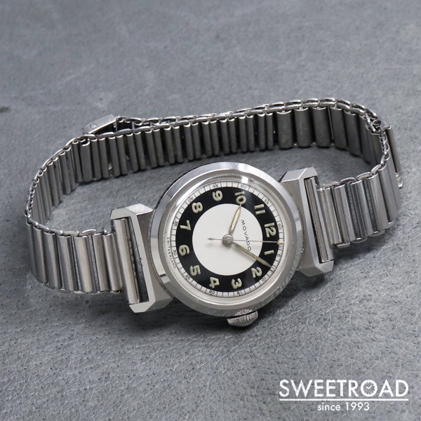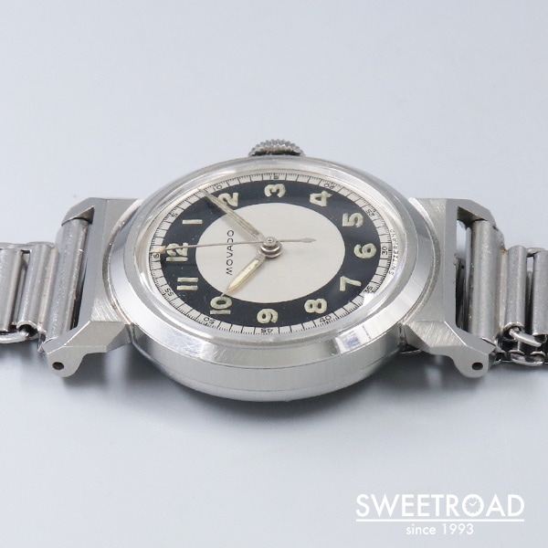 ブラックとシルバーが基調となったブルズアイダイヤルが目を引く、モバードのヴィンテージモデルが入荷しました。 針や夜光に経年が現れているもののダイヤルコンディションが抜群で、独特なツヤ感もしっかりと残っています。 径28ミリのお洒落なサイズが魅力的なボーイズサイズ。 オメガのグランドラックスやIWCのヴィンテージモデルにも採用されていた、ボリュームのある特徴的なラグが採用されており、製造したのは19世紀末から様々な防水構造を持つケースを発明していた老舗ブランド「FB(フランソワ・ボーゲル)社」です。 耐磁板を用いた二重裏蓋仕様で、経年による小傷がございますがケースエッジや刻印などがしっかりと残った良好な状態を保っています。 ブレスは1940年代頃に製造された、ボンクリップのバンブーブレスを装着しています。