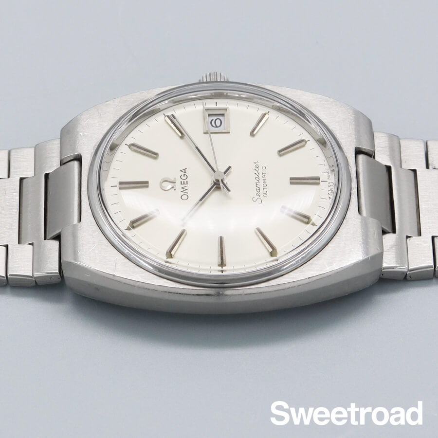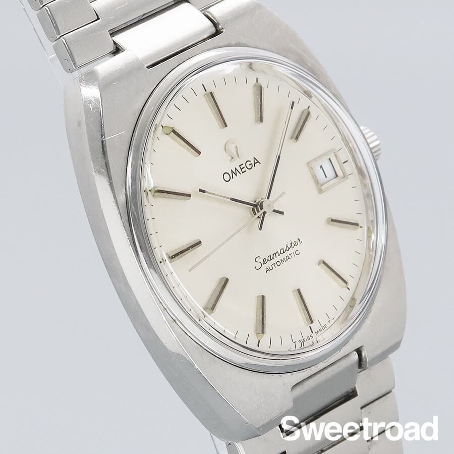 貴重な当時の純正BOX、ギャランティ、タグが付属するオメガの「シーマスター/Ref.166.0206」が入荷しました。同型のデイデイトモデルは多く見られますが、こちらは市場でもあまり見かけないデイトのみのモデルです。文字盤は、ほんのりとクリーム色に焼けたオリジナルシルバーダイヤルで、針に僅かな経年が見受けられますが、その他目立つ傷みのない綺麗な顔立ちが目を惹きます。ケースは70年代らしい丸みを帯びたトノー型ケースが採用されており、オメガ純正のリューズが取り付けられています。全体的に年式相応の小傷や打ち傷は感じ取れますが、当時のプロポーションを保ったオリジナルコンディションです。ムーブメントは日付のクイックチェンジ機能を持った実用性の高い自動巻「Cal.1010」を搭載しています。ベルトは着け心地の良いオメガ純正のステンレスベルトを装着しており、全長20.0cmの状態です。