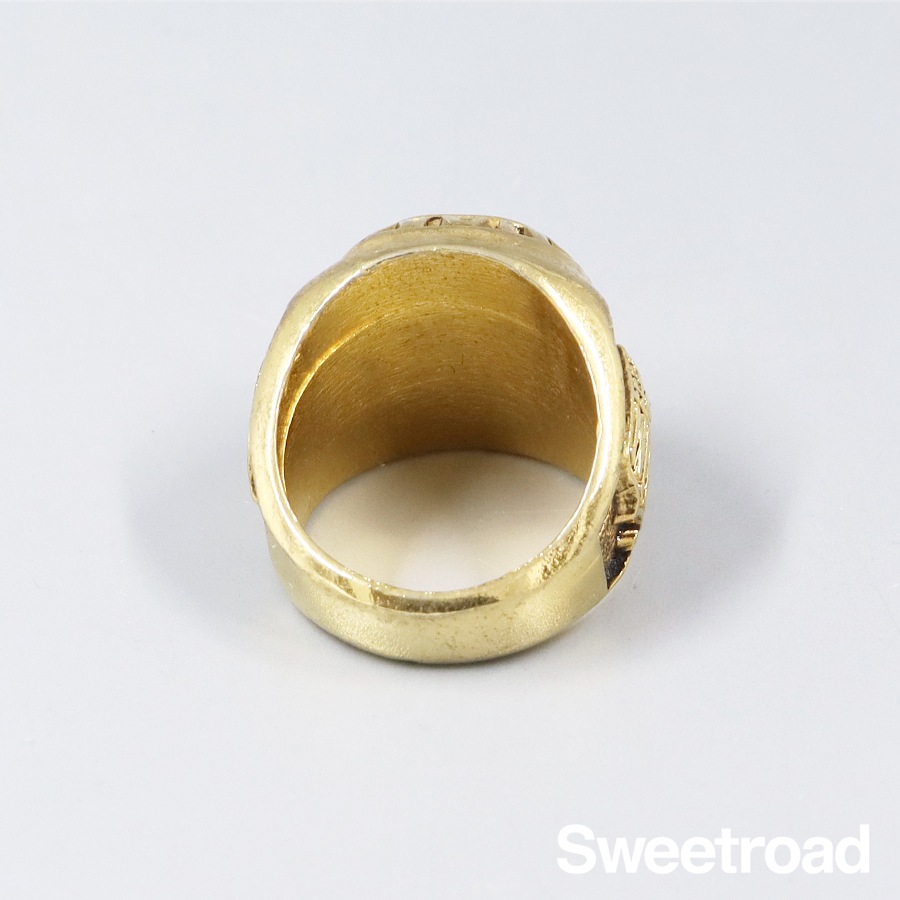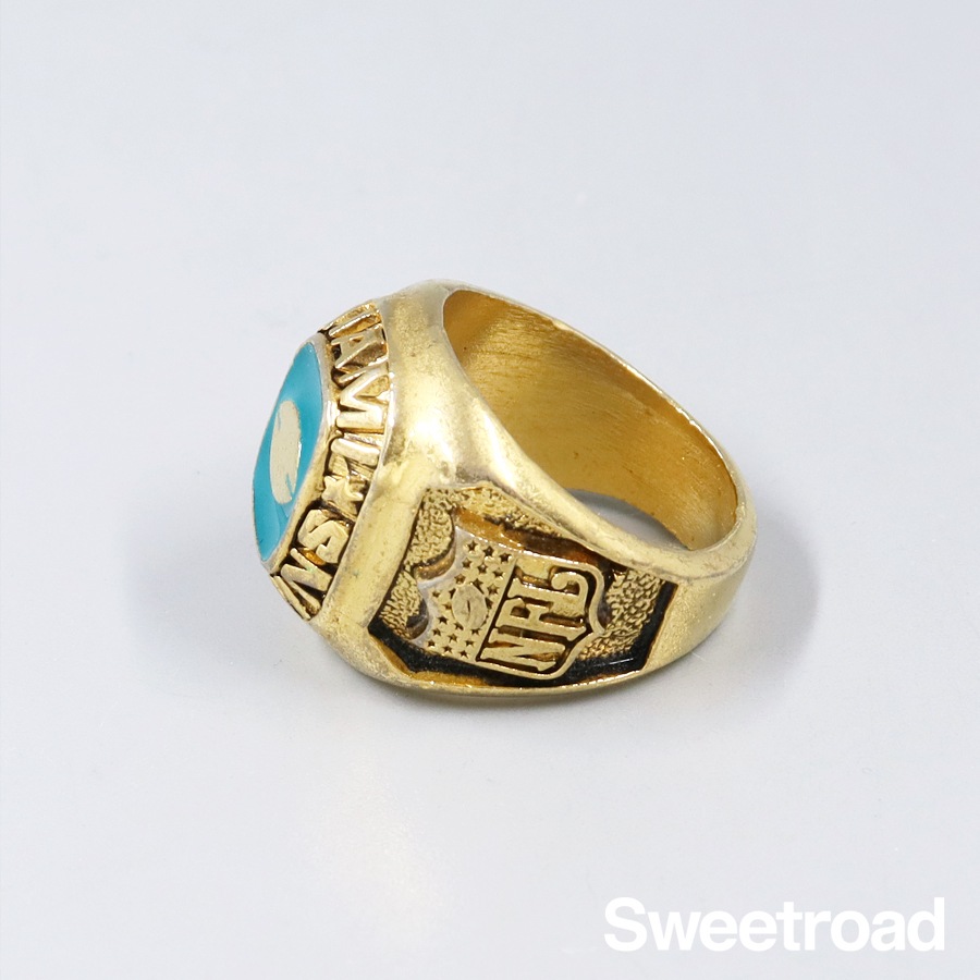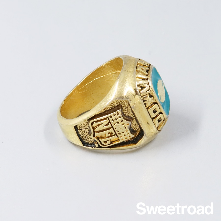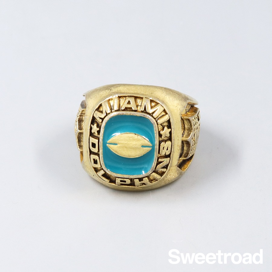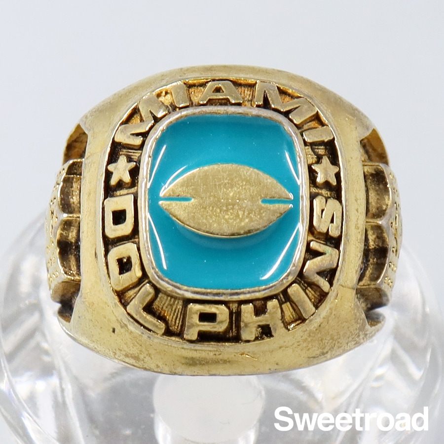NFL/アメリカンフットボールのチーム「マイアミ・ドルフィンズ」のコレクションリングです。 センターにはアメフトのボールとエナメル加工、リングサイドにNFLのロゴが彫り込まれています。 非常に細かい作りをしており、ファンにはたまらないデザインです。 若干の使用感がございますが、ゴールドメッキに剥がれは見られません。