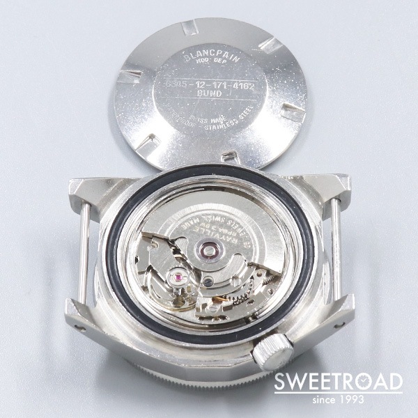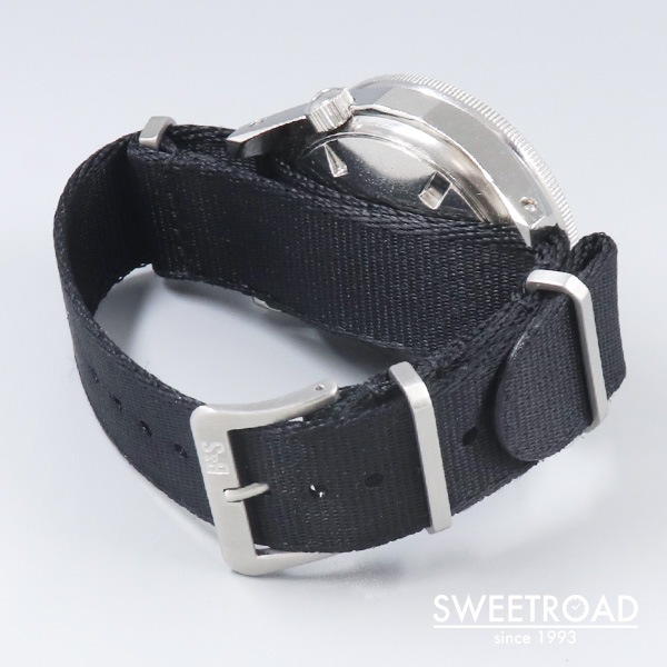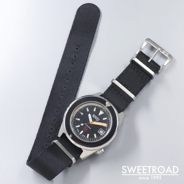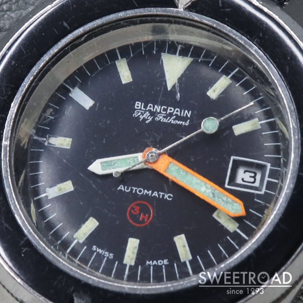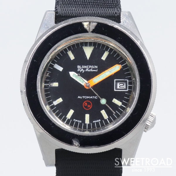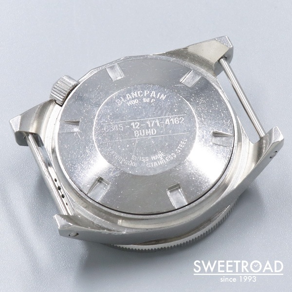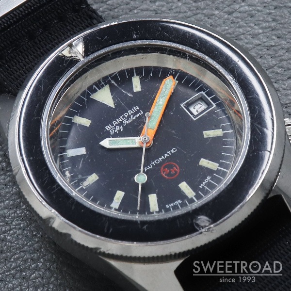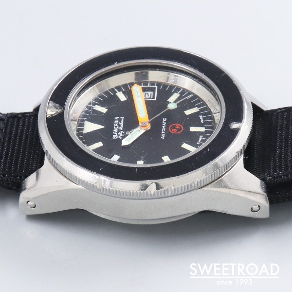- 1970年代に西ドイツ海軍に納入された、ブランパンのダイバーズウォッチです。 西ドイツ海軍からの要請で製造されたもので、市販品はありません。 41.5ミリのボリュームのあるケースに、目盛りのない独特なベゼルが存在感抜群です。 艶感の残ったオリジナルのダイヤルにトリチウムをトリチウムを表す「3H」マークが配されており、文字盤中央に針スレ、外周にプリント剥がれが見られますが、それほど気になるものではございません。 ベゼルディスクはベークライト製でルミナスポイント部分に割れが見られますが、これは経年変化により収縮したことが原因と考えられ、ほとんどの個体がこのような状態になっています。 外装には打痕や使用感がございますが、裏蓋の刻印はしっかりと残っています。 ベルトはBULANG&SONSのデラックスナイロンNATOベルトを装着しています。