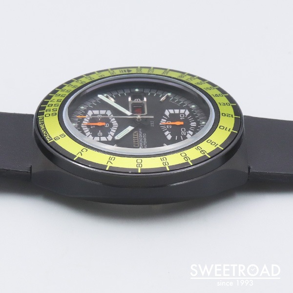 - ライムグリーン色のベゼルが一際目を惹く70年代シチズンの希少モデル、通称「スペースマン」が入荷しました。 本商品は、当時の純正BOX、裏蓋保護シール、延長バックルが残った貴重な「未使用品」の個体です。 コンディションを保った個体が少ない中、本品は文字盤、外装共に目立つ傷や劣化のない非常に綺麗なコンディションです。 ベゼル4時位置に僅かな擦れ傷、9時位置に打痕が見受けられますが、ここまで綺麗な状態を維持した個体は市場でもあまり見かけません。 ベルトは当時の純正品と雰囲気が近い新品のレザーベルトが取り付けられており、シチズン純正のバックルが取り付けられております。 未使用の状態ですので、実用する場合には納品前のOHをお勧めいたします。