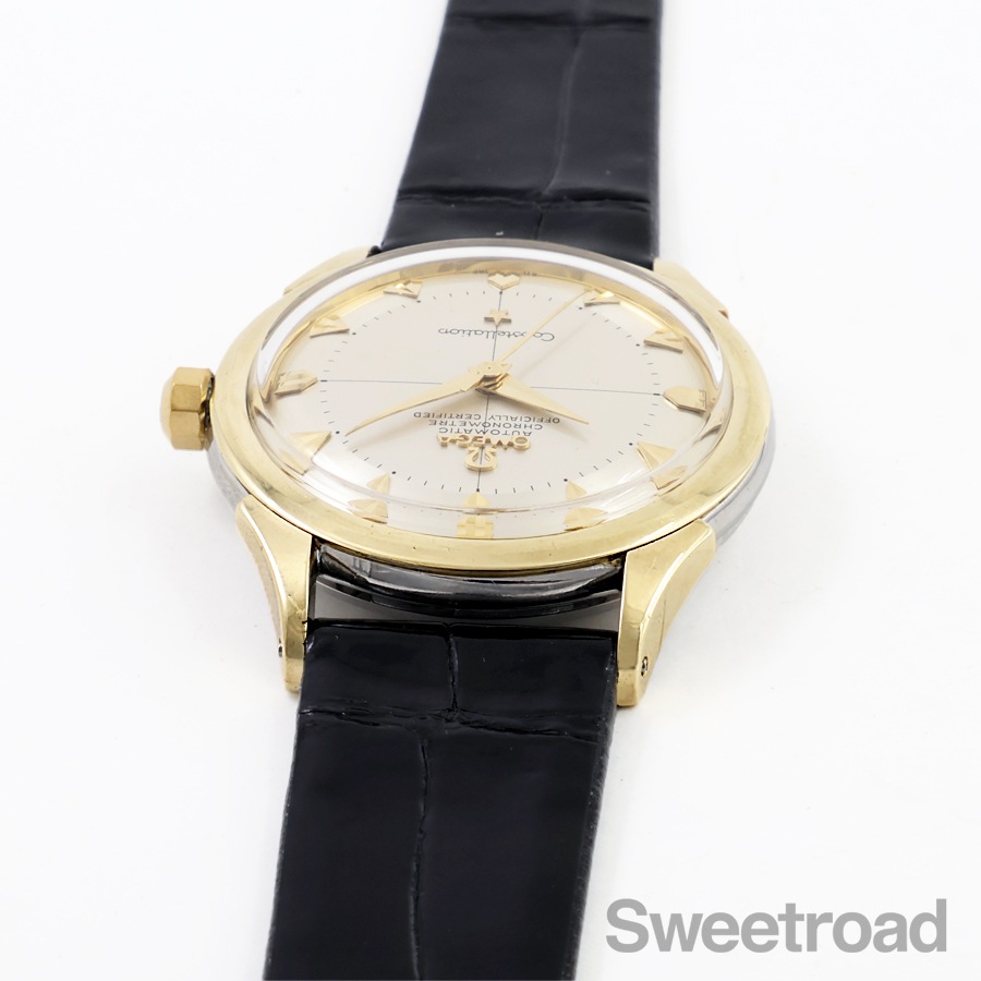 1954-55年に製造された希少な初期型の個体で、煌びやかなコンビケースにゴールドのドーフィン針、ハートインデックスが配されたオールドな顔立ちが目を惹きます。