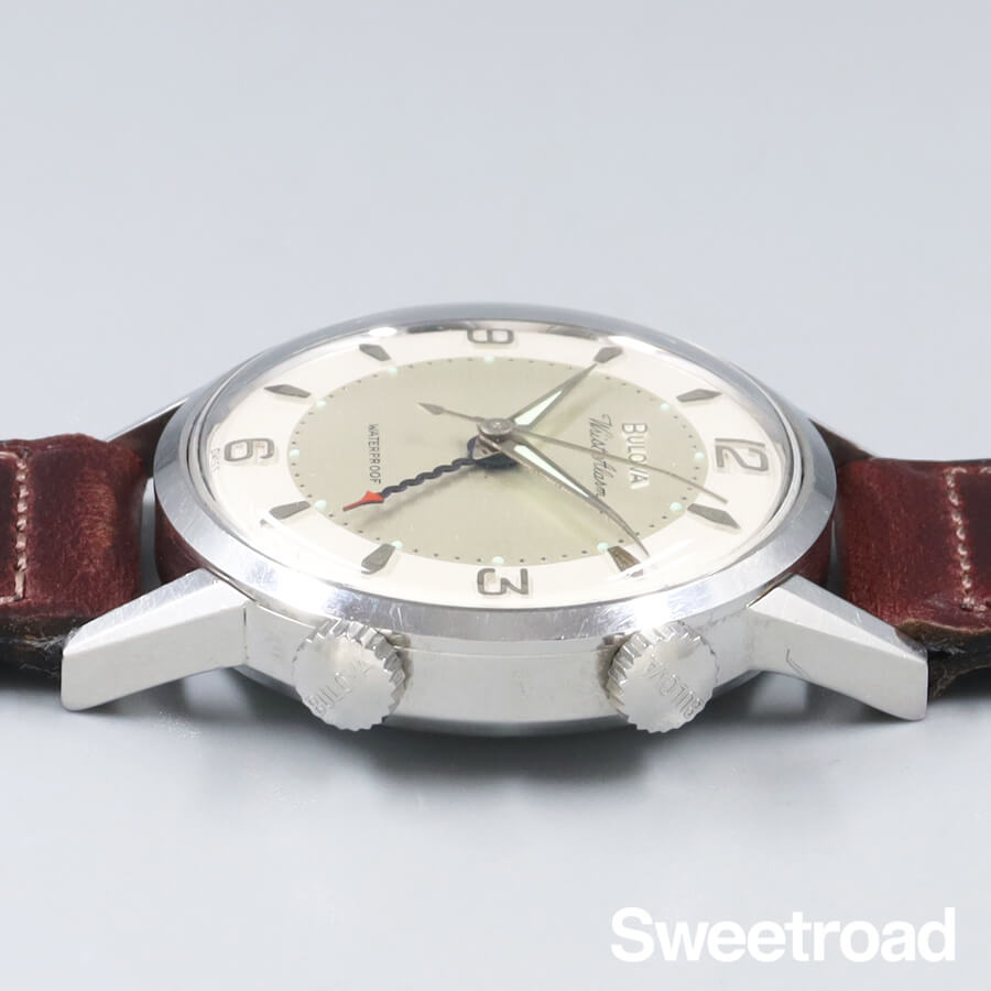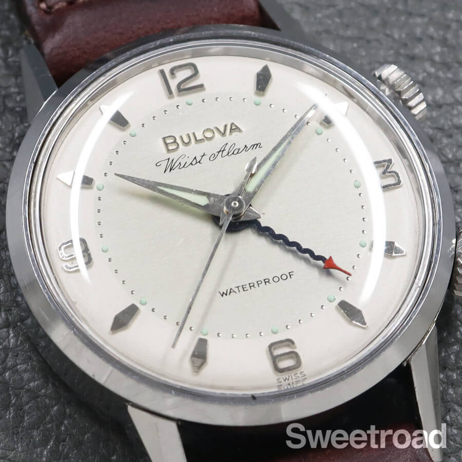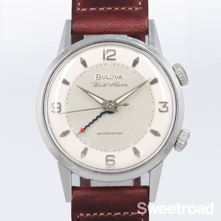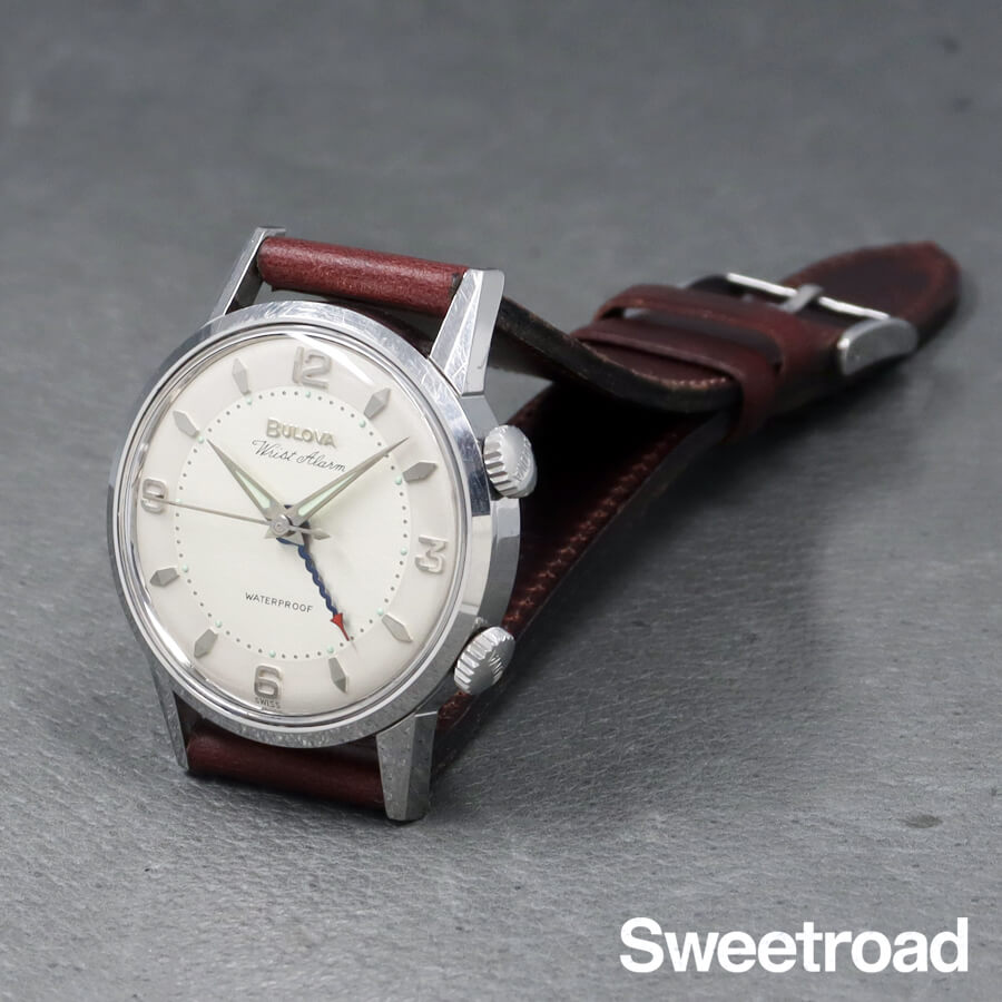 1963年に製造された、ブローバのリストアラームです。 視認性の高いオリジナルのツートンダイヤルに、立体的なインデックスが配された存在感のある個体です。 ニョロニョロとしたデザイン性の高いブルースチール仕様のアラーム針も魅力的です。 ケースには経年による小傷などがございますが、雰囲気を損なうような過度な傷みは見られません。 ベルトはアキュレイトフォルムのレザーベルトを装着しています。