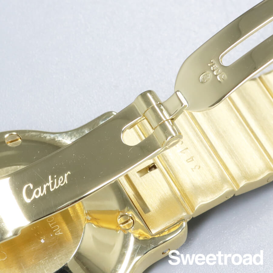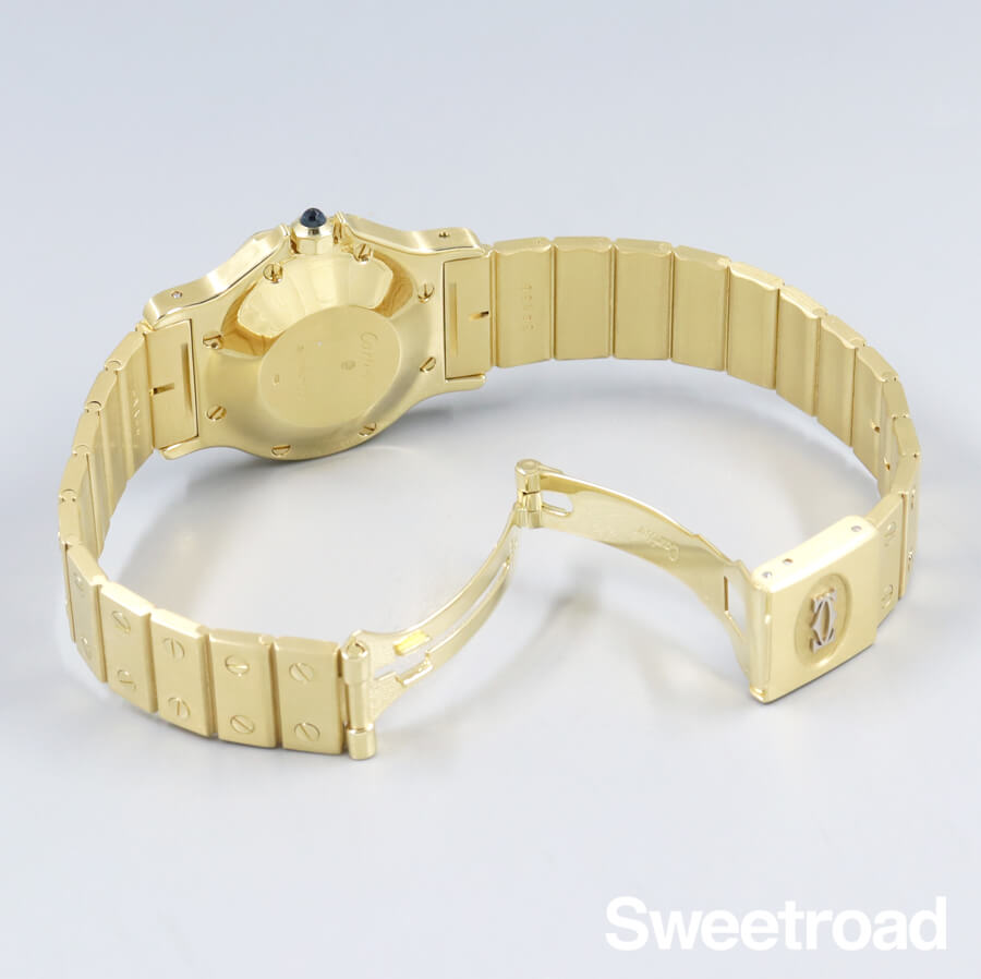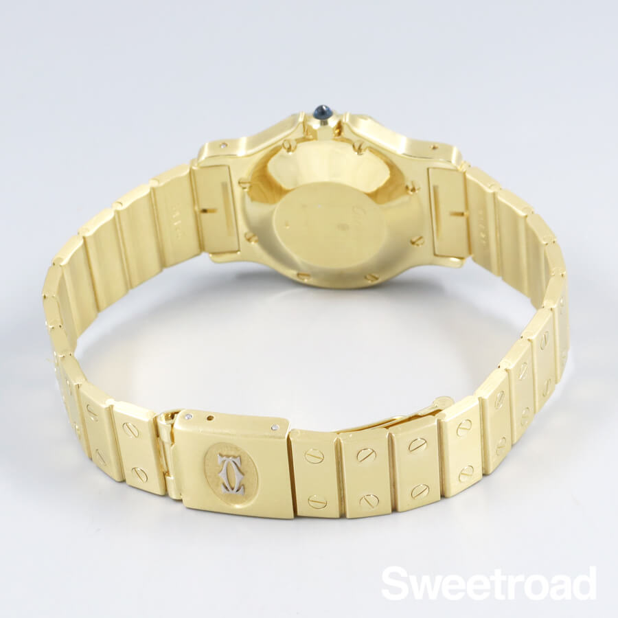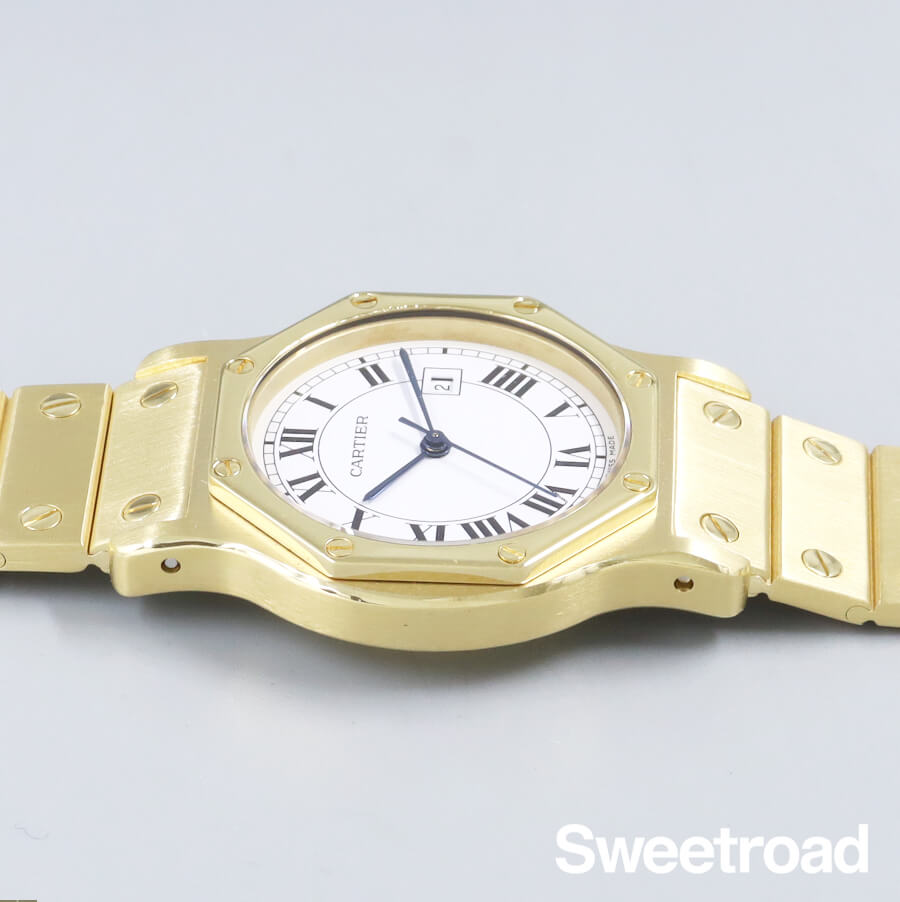 - カルティエの中でも高い人気を誇る、8角形を基調とした個性的なデザインが採用された「サントス・オクタゴン」。 ホワイトローマンダイヤルにブルースチール針が配された、カルティエらしいデザインが目を引きます。 LMサイズのユニセックスな個体で、ケース本体とブレスレットがともに18金イエローゴールド無垢仕様という最高級機種です。 ベゼルにはわずかに小傷が現れていますが、全体的に目立つような打痕や減りは見られず、裏蓋の刻印もしっかりと残っており、ベルト全長20.0cmと十分な長さがございます。 本商品には、大きめのカルティエ純正BOXが付属いたします(ギャラなどは付いていません)。